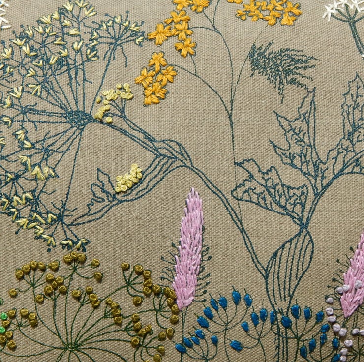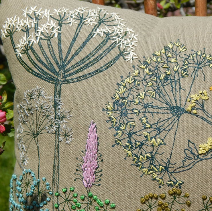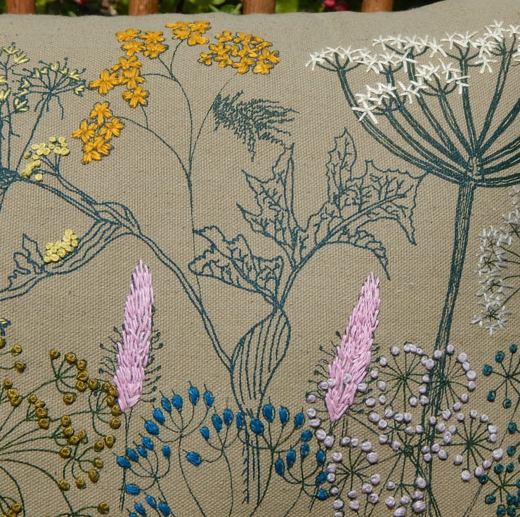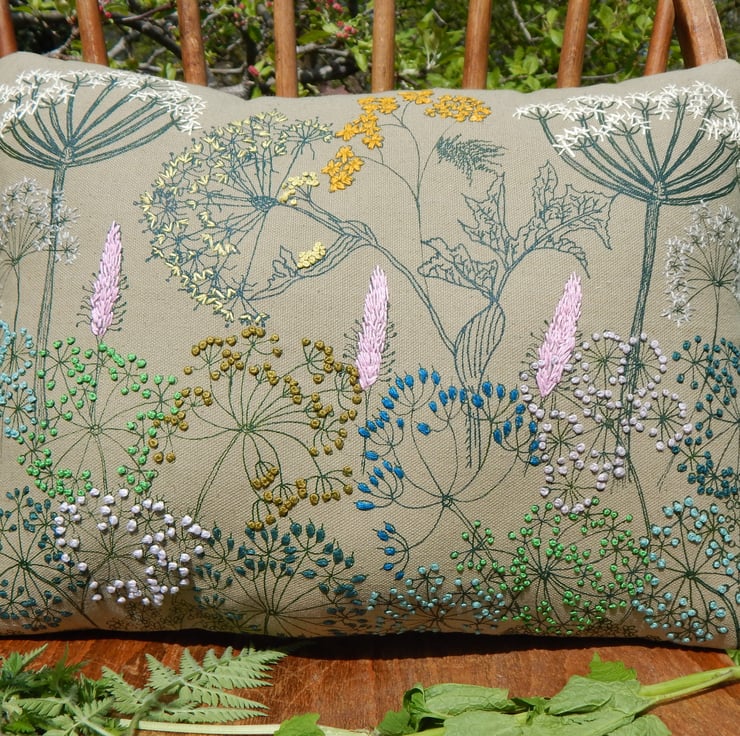 This is a green cotton canvas cushion that has been screen printed with my own designs. Many have been individually printed which involves positioning, printing an individual flower, drying and then repeating. This gives you an absolutely one off, designed cushion. Almost each flower then is hand embroidered to lift the petals from the fabric and give a pop of life and colour. The Cow Parsley have french knots and there is hoary plantain, hogweed and yarrow.