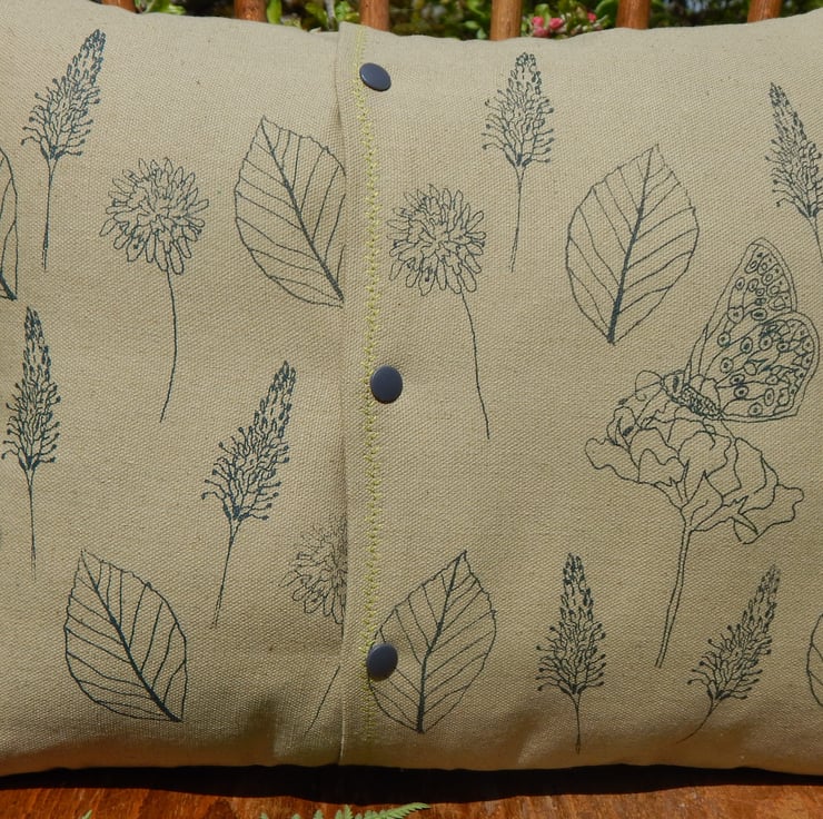 The reverse of the cushion has been screen printed with beech leaves, butterfly and birds foot trefoil and hoary plantain and scabious. The cushion is an envelope style with 3 poppers to stop any gaping.