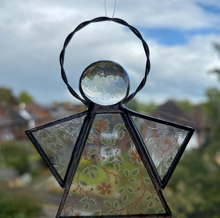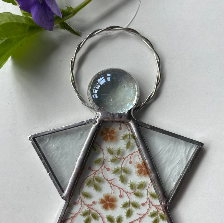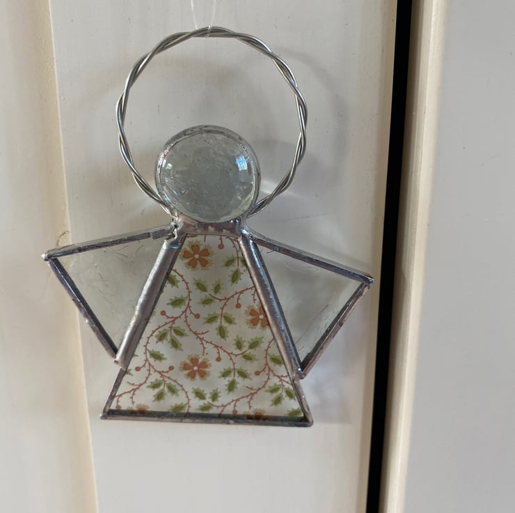 A beautiful stained glass angel made using the Tiffany ( copper foiled ) method of stained glass .She has a beautiful dress made in pink and green flowery glass and 2 wings in a pattered clear glass. Her head is a clear glass nugget surrounded by a twisted wire halo.
