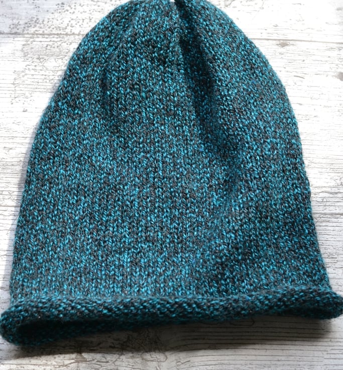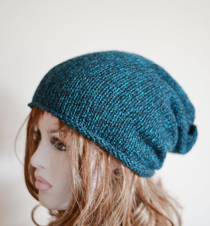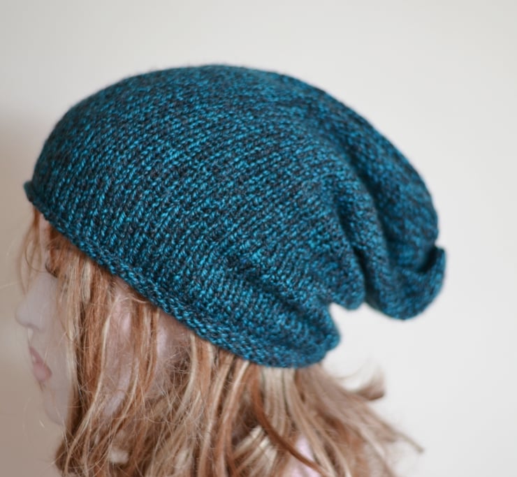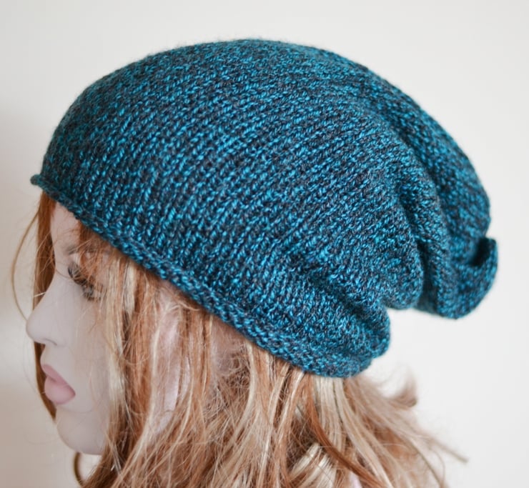 Unisex slouch beanie hat. Fits one size. Made in a marl yarn in teal and black. Made inacrylic with 25% wool fibres. This is a clearance hat sale.