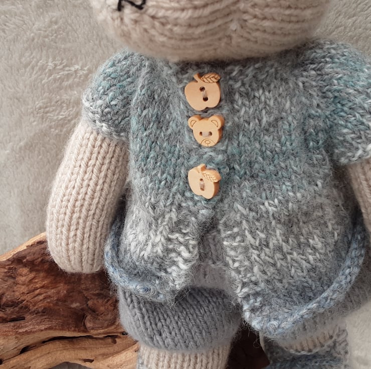 He wears a removable cardigan in DK variegated yarn with 3 wooden buttons to the yoke, 2 x apple shapes and one bear head.
