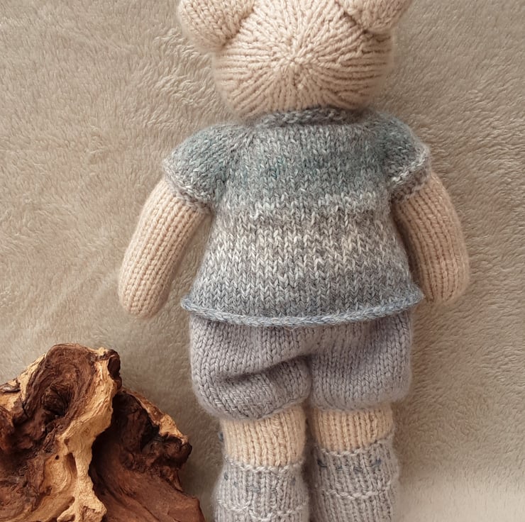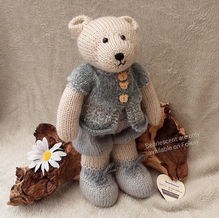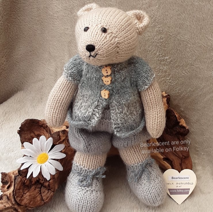 Hand knitted dressed teddy bear created by Bearlescent, this is not an original design and is based on a pattern by Mary Janes Tearooms, permission to sell completed bears is allowed.