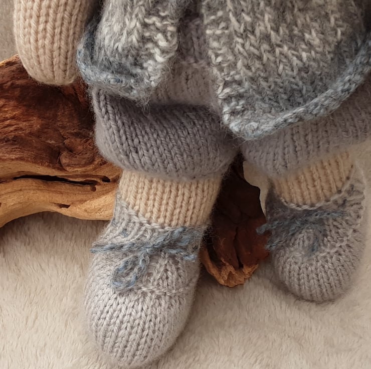 He wears blue removable breaches and matching blue boots which form part of his lower leg/feet knitted from the same aran yarn.