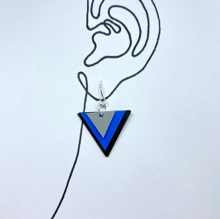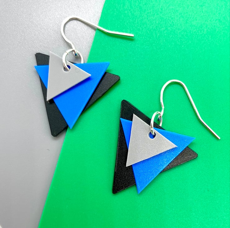 Channel the 80’s with these retro triangle earrings in a true 80’s colour combo! The three triangles in grey, blue and black are graduated in size and all move independently. They have been hand cut from plastic sheet offcuts, a waste product of the production process, now saved from the landfill by being made into jewellery.