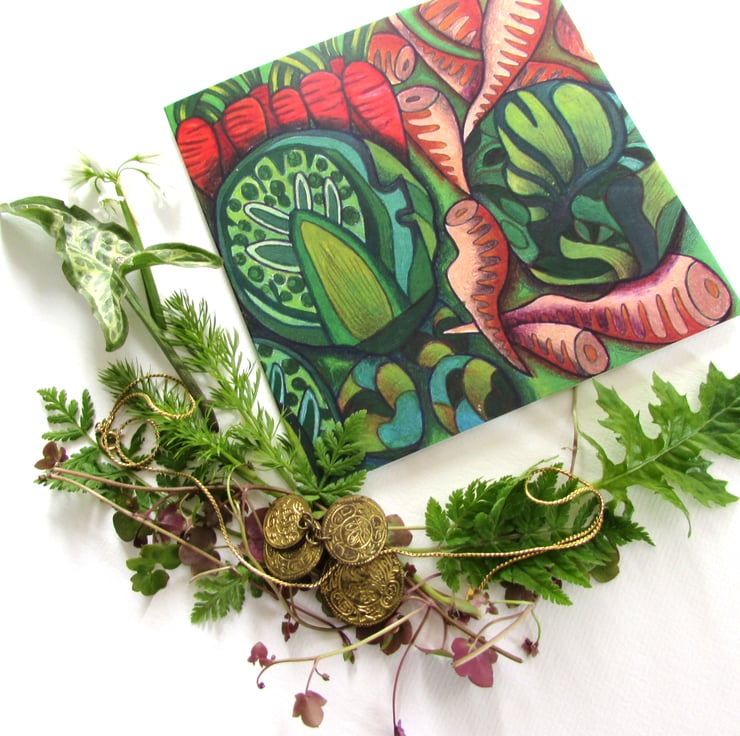 A square card (140mm x 140mm) printed digitally on 330gsm card and hand finished. Supplied with a white envelope and a clear cellophane wrapper. Blank inside for your personal message.
