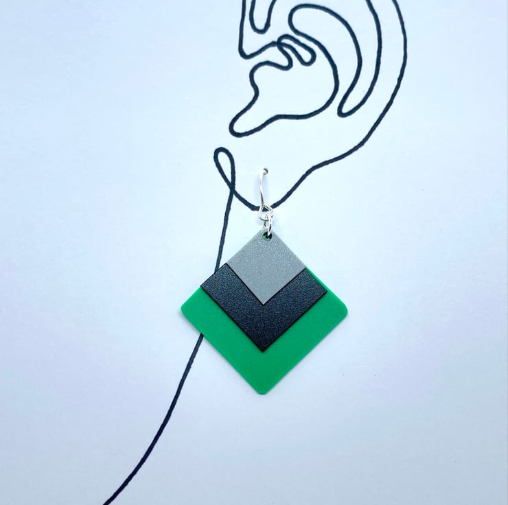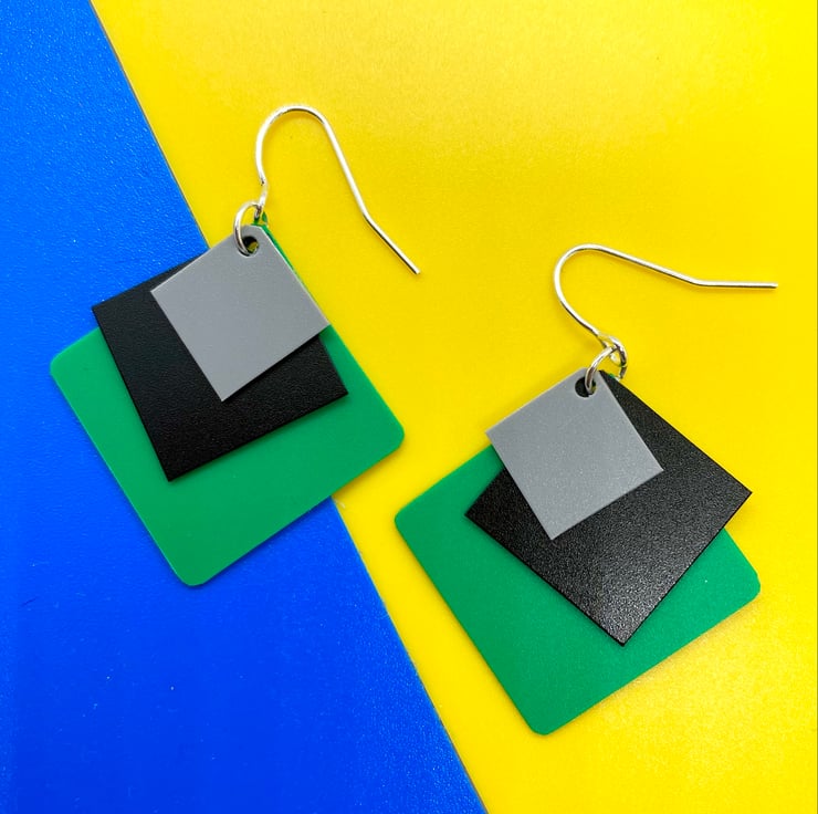 Get yourself disco ready with these bold 80’s style square earrings! Featuring three graduated squares which all move independently in a retro grey, green and black colour combination. These vivid colour block earrings have been hand cut from plastic sheet offcuts, a waste product of the production process, now saved from the landfill by being made into jewellery. They are super lightweight to wear and have lovely movement.