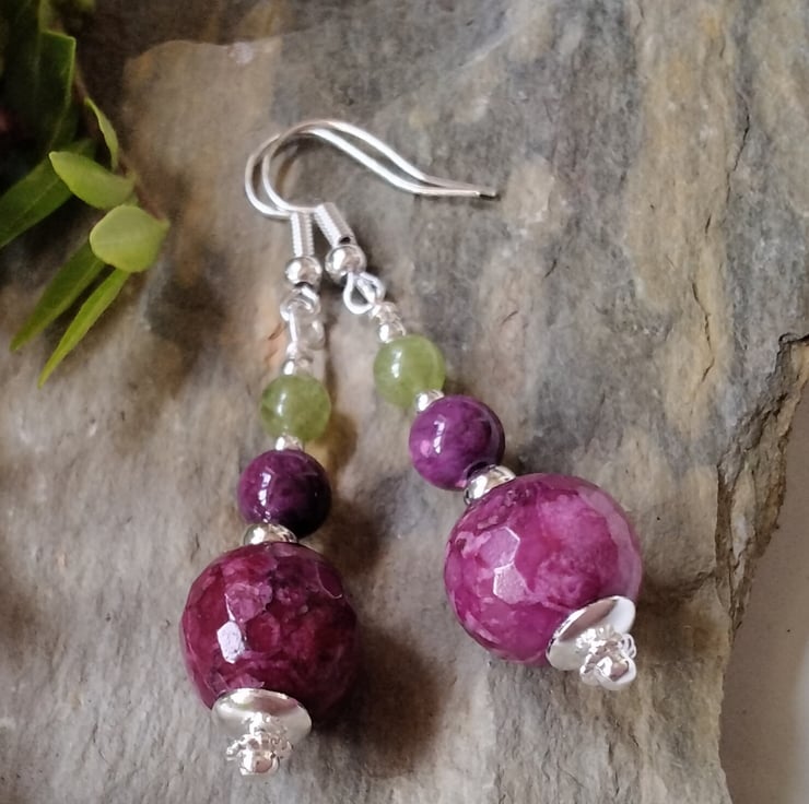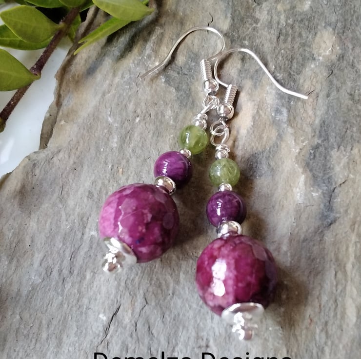 I have hand crafted them using purple faceted 12 mm infused dyed agate gemstone rounds, complimented with smaller 6mm faceted infused dyed quartzite rondelles and 5mm genuine natural peridot rounds.