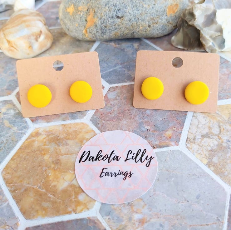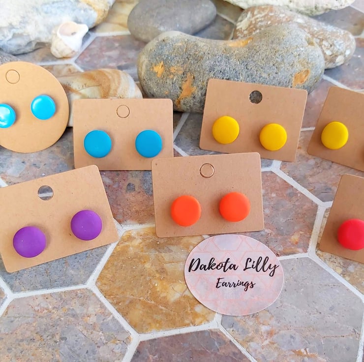 Bright coloured polymer clay earrings on gold or silver coloured studs.