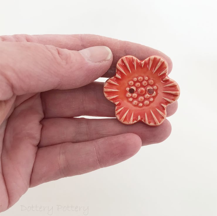 This large pottery button is made from white earthenware clay, embossed and glazed on the front. It is then fired to 1100 degrees, so nice and strong. Slightly concave. It measures 4cm x 3.5cm.They can be handwashed or machine washed on a low temperature. Perfect for all sorts of arts and craft projects.