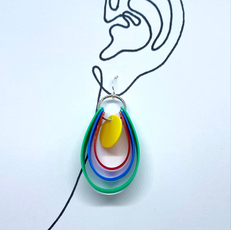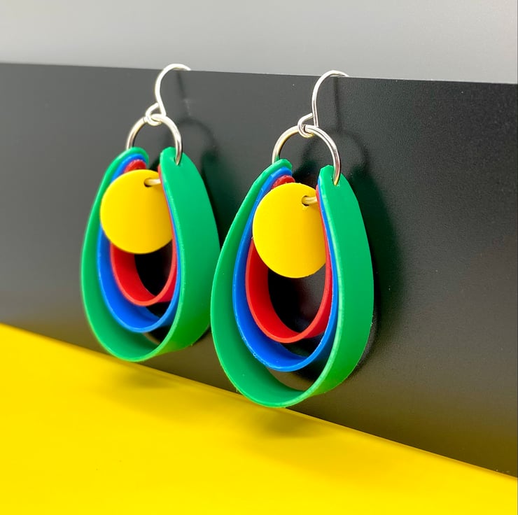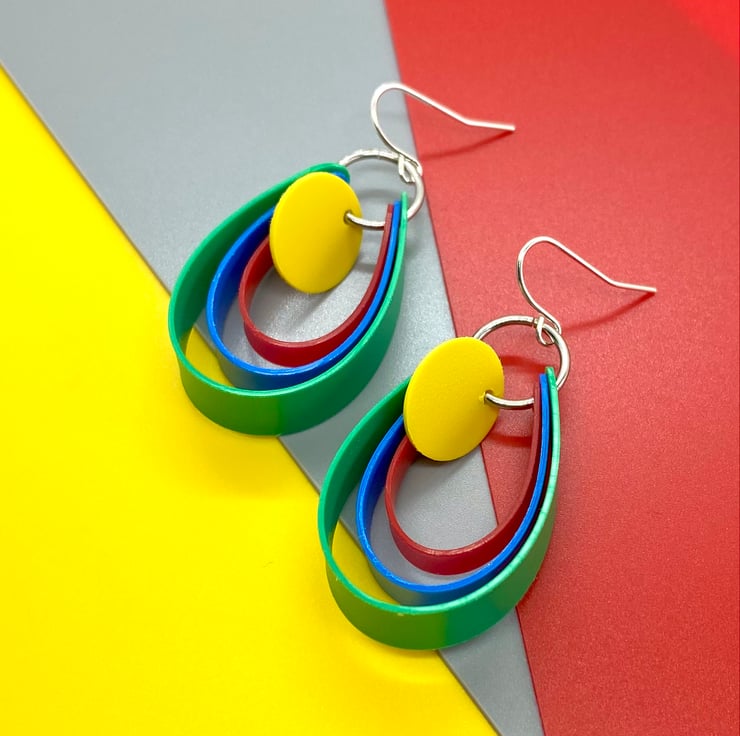 Perfect for day wear or disco wear! These 80’s style earrings feature a graduated loop design, with each loop in a different primary colour. In the centre hangs a single yellow disc which moves independently. Each part of these earrings have been hand cut from plastic sheet offcuts, a waste product of the production process, now saved from the landfill by being made into jewellery. They are sure to add a retro pop of colour to any outfit!