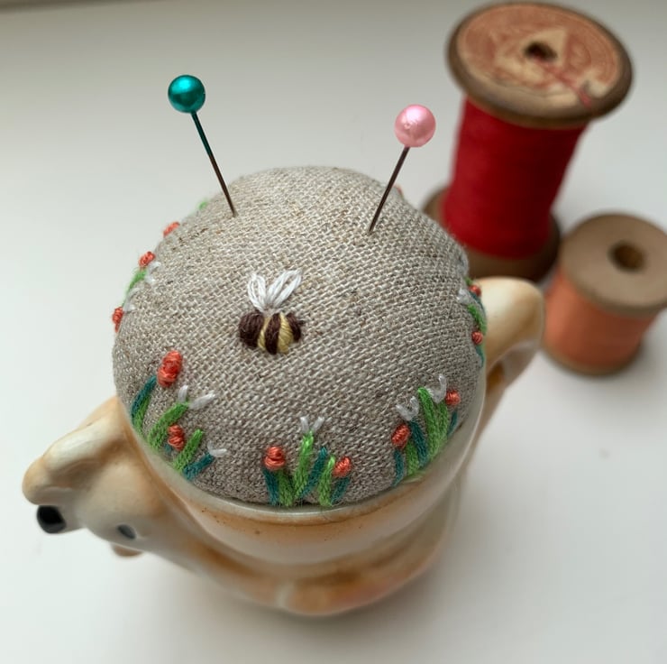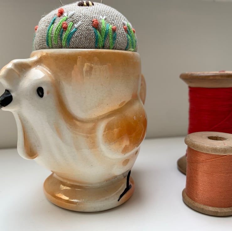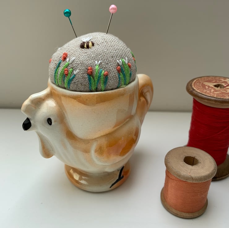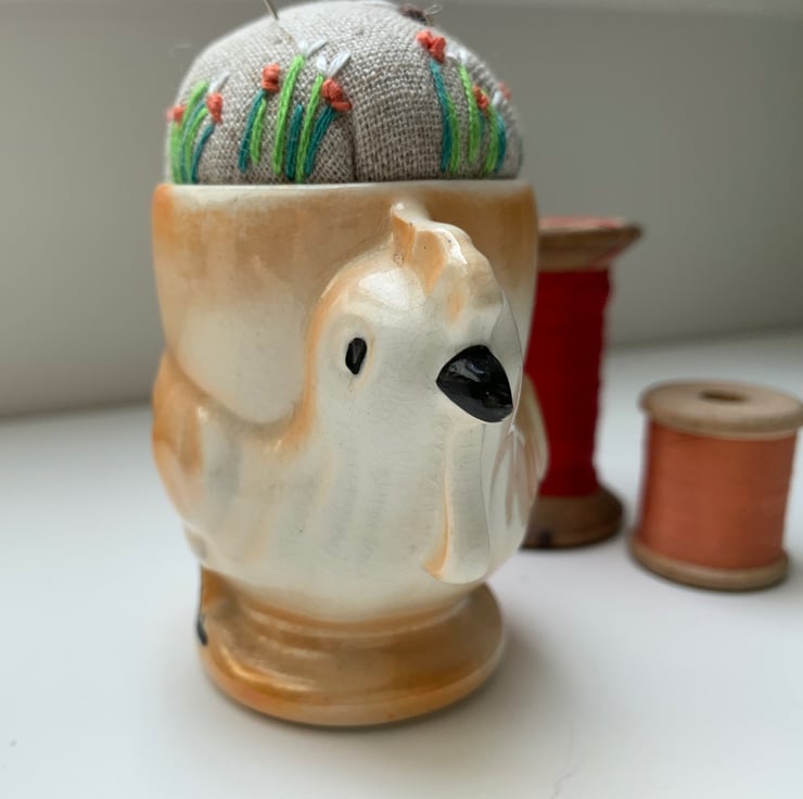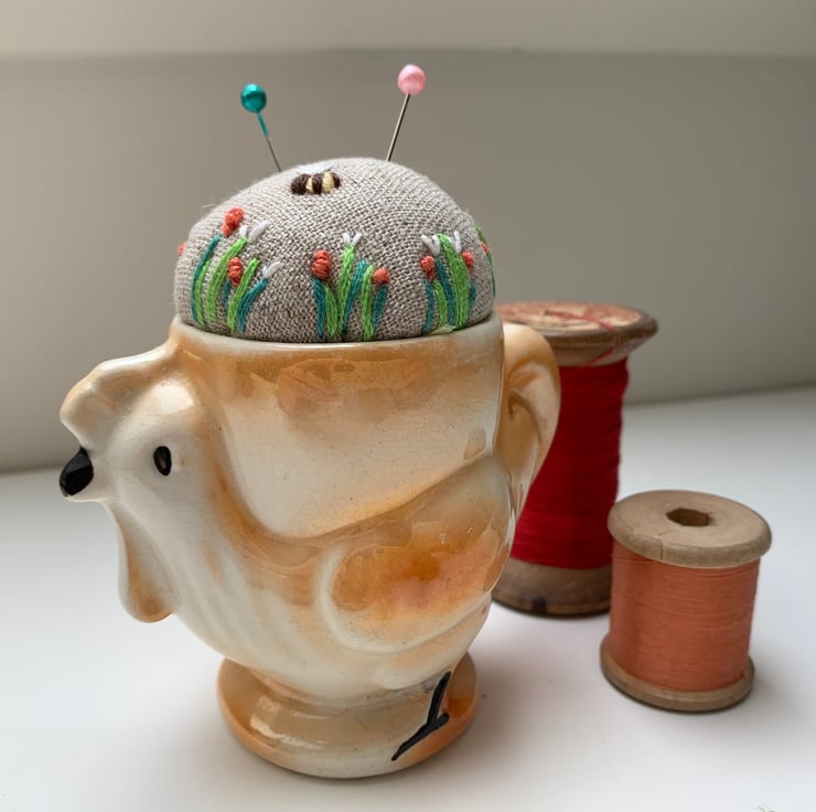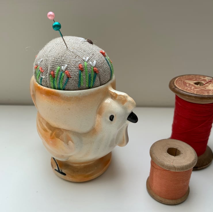 Cute little pincushion in a novelty egg cup. The vintage chicken egg cup has a lovely lustred finish and holds a linen cushion which has been embroidered with tiny flowers and a bee.