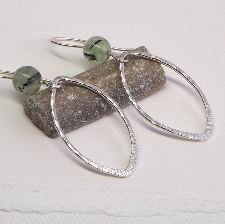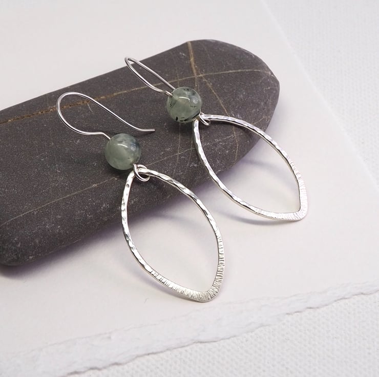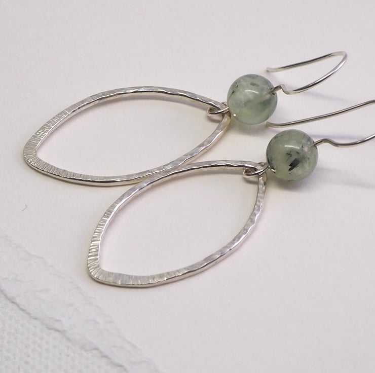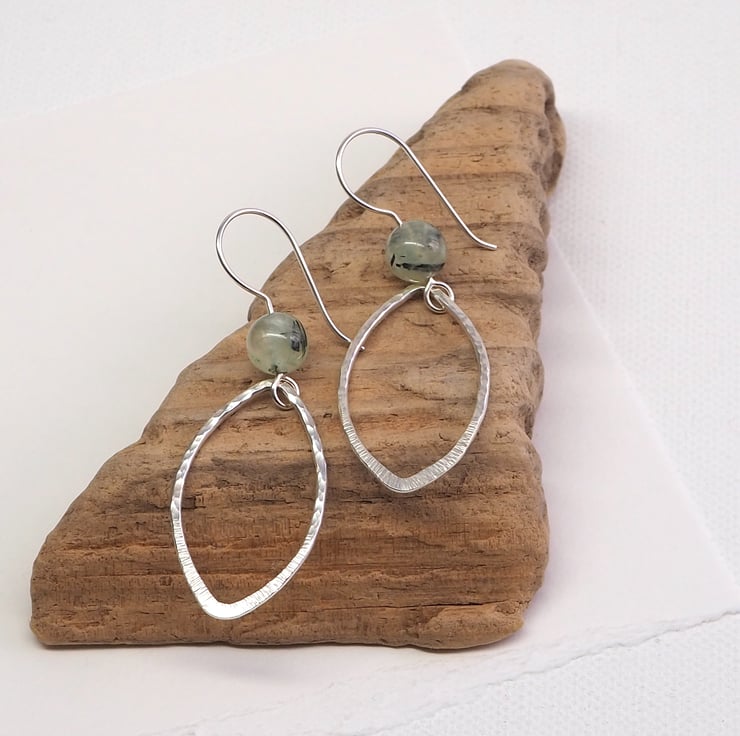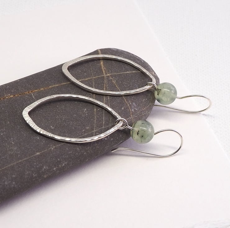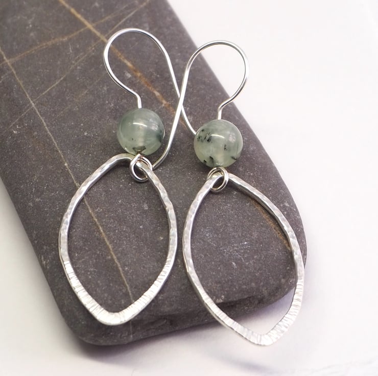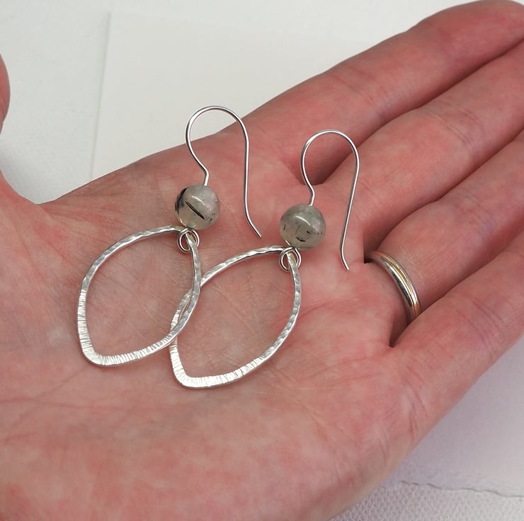These stylised leaf dangly earrings are hand forged from quality Argentium silver 940 (hypoallergenic, purer than sterling, tarnish resistant & recycled). They have two different hammered textures on the leaf and are topped with a semi-precious stone bead (options detailed below). The earrings are polished to a bright shine to finish.