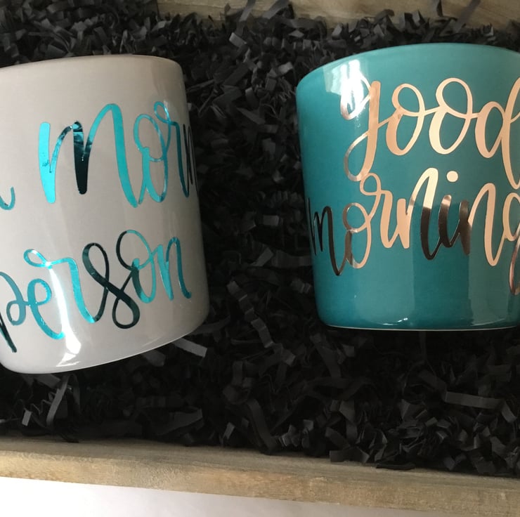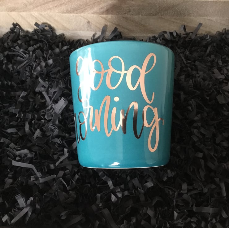 Good morning in gold stands out with the lovely bluey green mug.