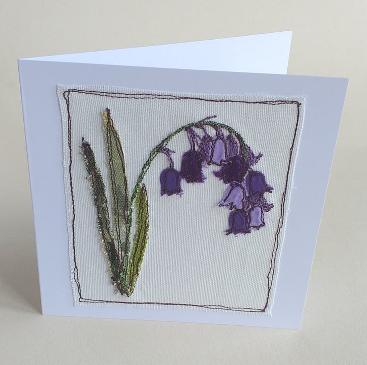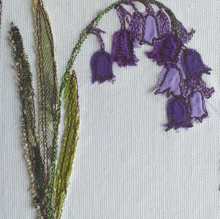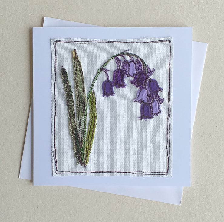 A lovely card depicting a spray of bluebells. Each leaf and flower is individually hand cut from fabric scraps and then sewn onto a plain background using free motion embroidery. Other petals and details are also added in different coloured threads. The embroidery is then sewn straight onto a white, recycled card. This card can also be personalised. Please specify wording at checkout if required.