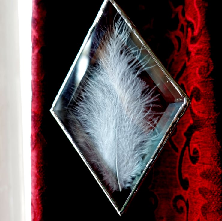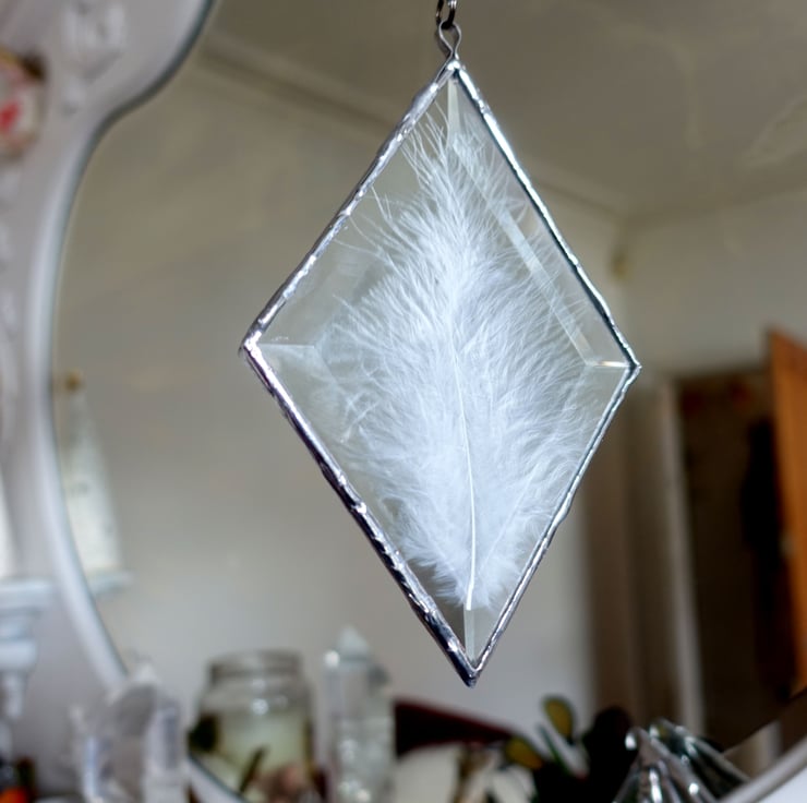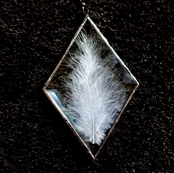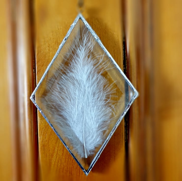 A large white feather encased between two diamond bevelled glass pieces. This suncatcher is quite large, approx 6 inches from tip to tip and is foiled and soldered in the Tiffany technique to produce a long lasting truly beautiful angelic ornament.
