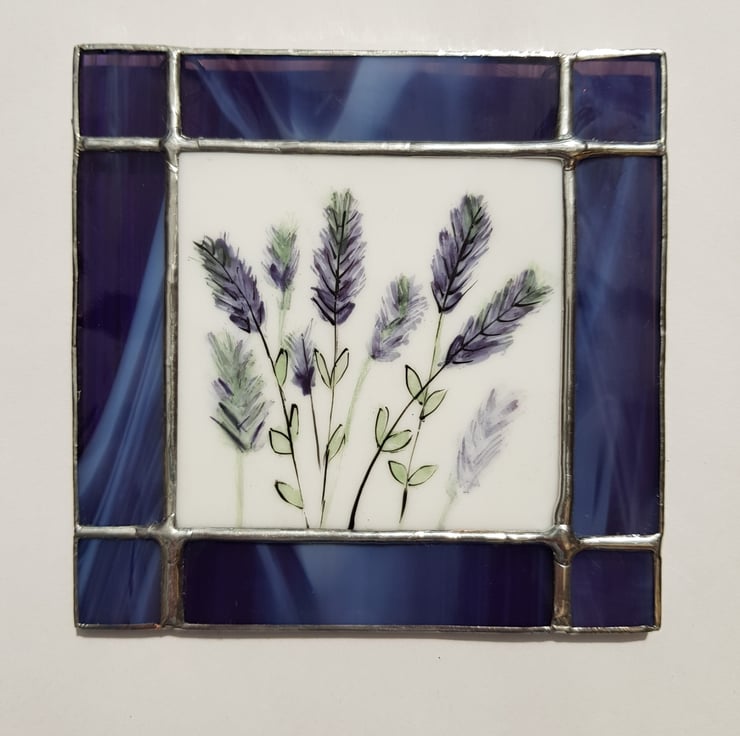 Lavender is a symbol of serenity, calm and grace. It is hand painted and then fired in the kiln. The piece is then constructed using the copper foil technique.