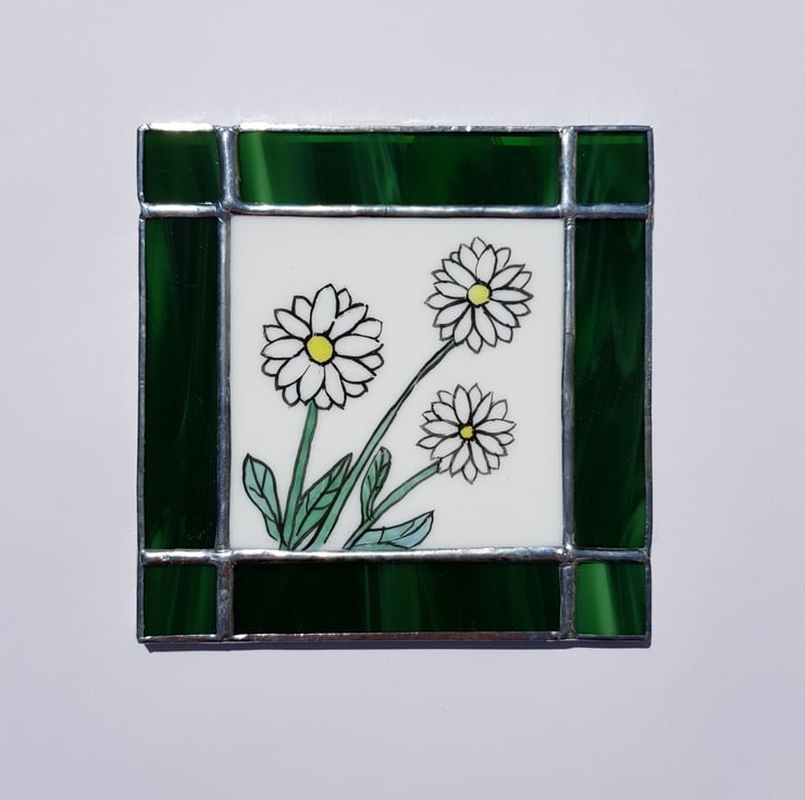 The daisy is a symbol of innocence and purity. It is hand painted and then fired in the kiln. The piece is then constructed using the copper foil technique.
