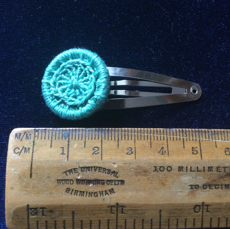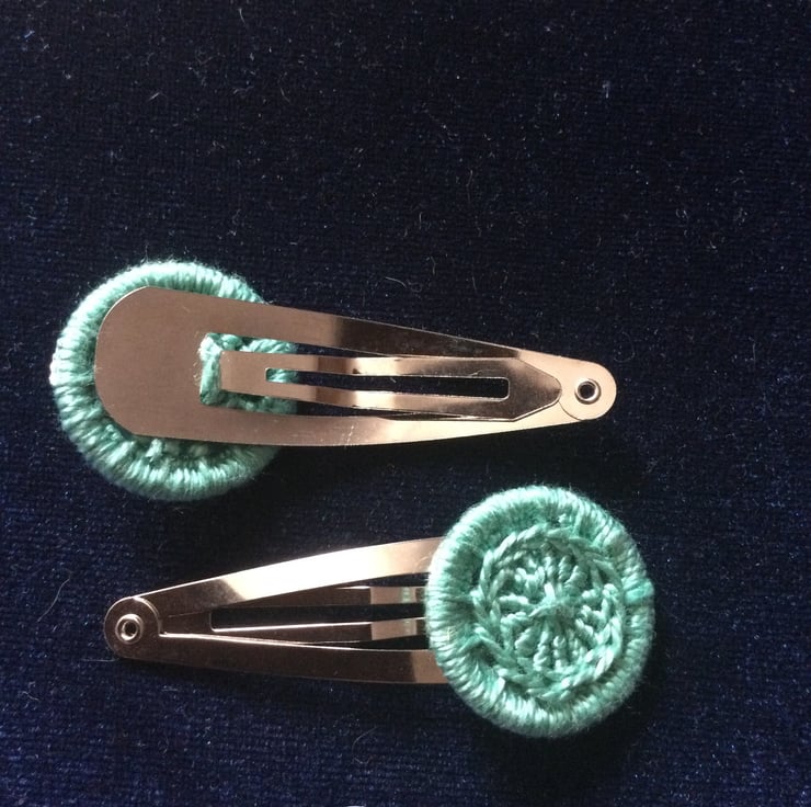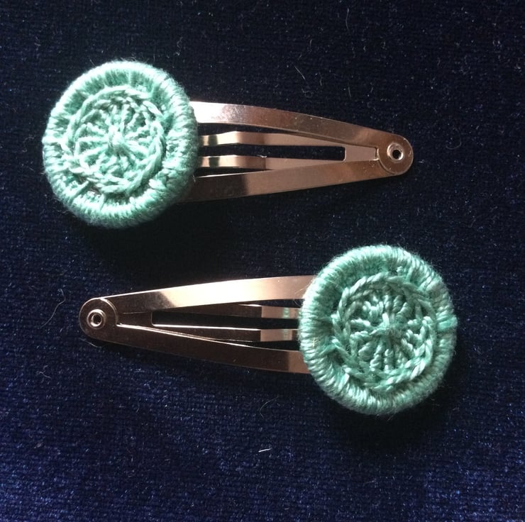 This pretty pair of Dorset button hair clips feature cross wheel buttons made with a jade green coloured cotton thread. The buttons are worked on a 21 mm brass ring and are fixed to the simple snap closing hair clip as part of the construction of the button.