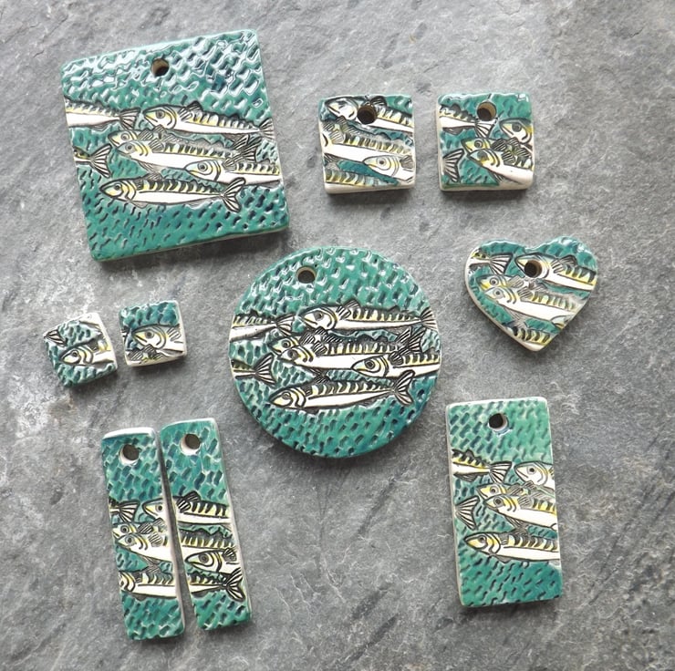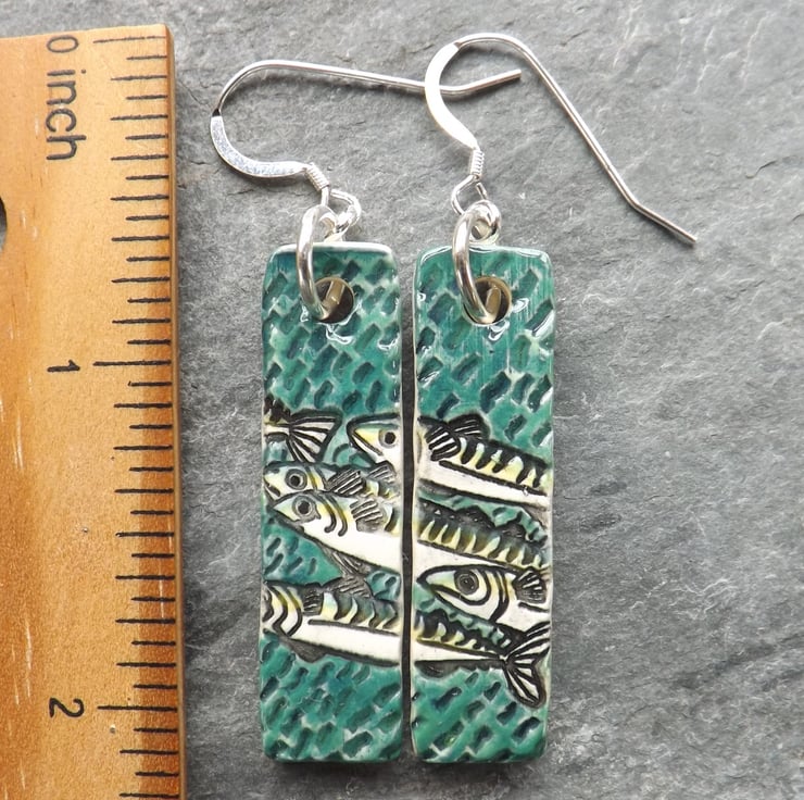 These long drop earrings have a background of sea green with a shoal of mackerel darting across, a snapshot of local marine wildlife.