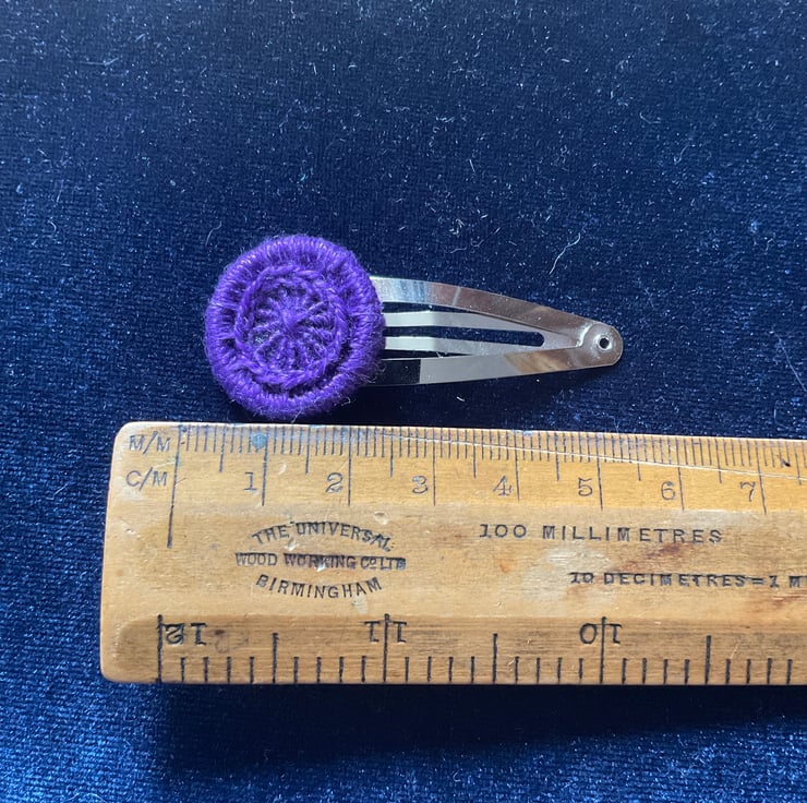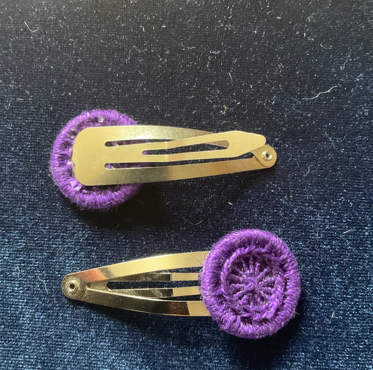 This pretty pair of Dorset button hair clips feature cross wheel buttons made with a purple coloured cotton thread. The buttons are worked on a 21 mm brass ring and are fixed to the simple snap closing hair clip.