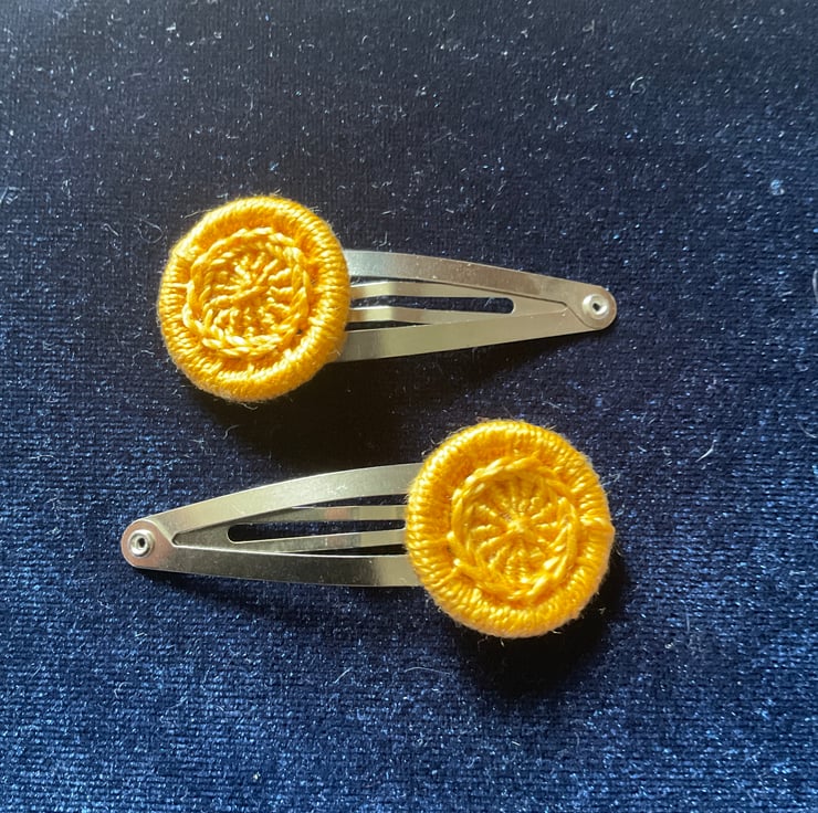 This pretty pair of Dorset button hair clips feature cross wheel buttons made with a gold coloured cotton thread. The buttons are worked on a 21 mm brass ring and are fixed to the simple snap closing hair clip as part of the construction of the button.