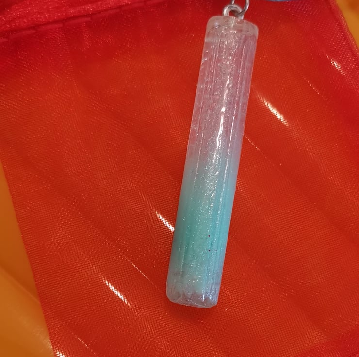 This pendent is made with a creamy green ink and blue glitter added to clear resin, it does have a matt finish but it also sparkles when hitting the light, very unique piece of jewellery, I paired this pendent with two green cords and a piece of white sparkly se through ribbon, it had been finished with a lobster clasp and extra chain for exstenion