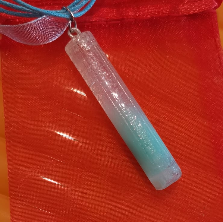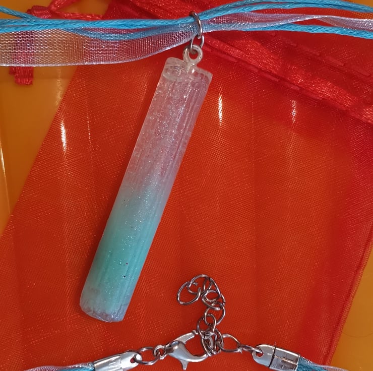 This pendent is made with a creamy green ink and blue glitter added to clear resin, it does have a matt finish but it also sparkles when hitting the light, very unique piece of jewellery, I paired this pendent with two green cords and a piece of white sparkly se through ribbon, it had been finished with a lobster clasp and extra chain for exstenion