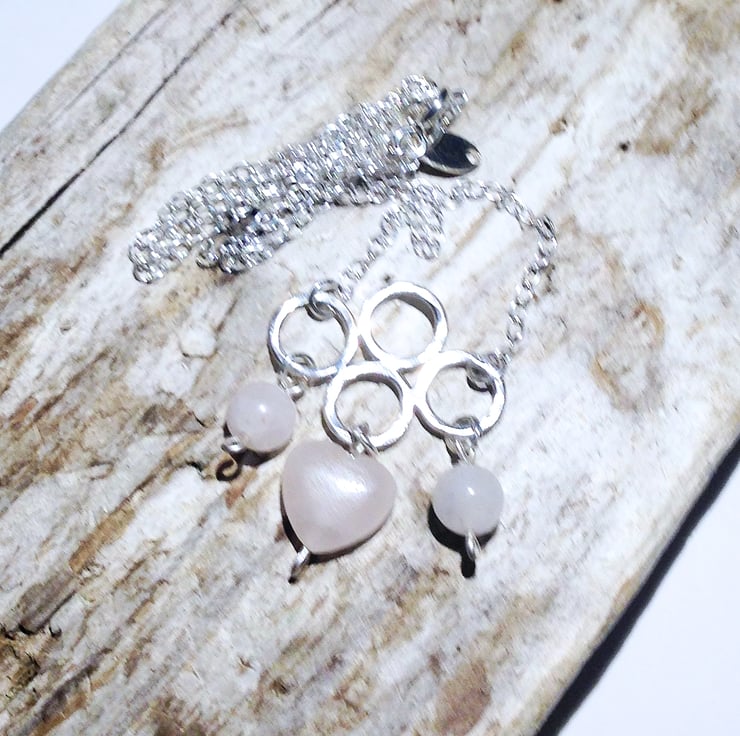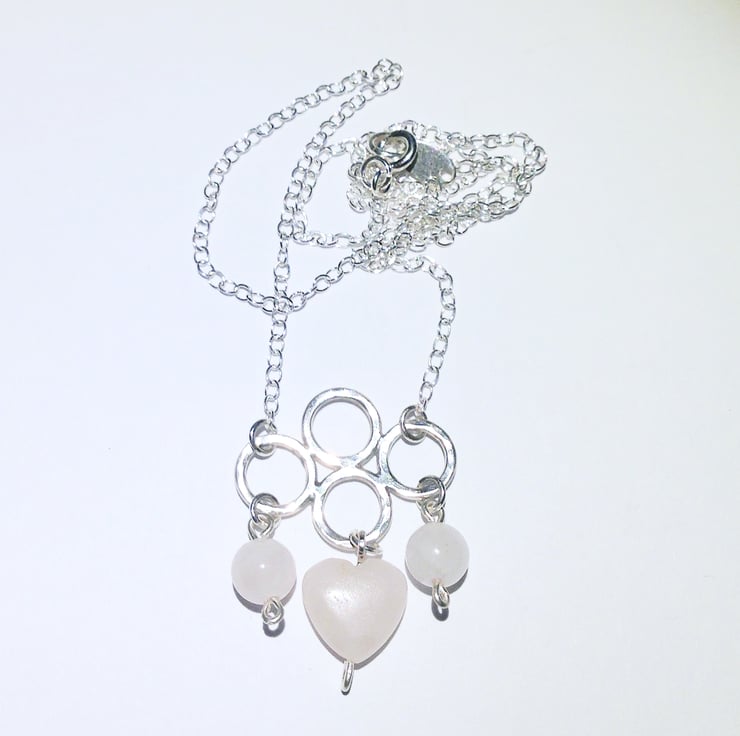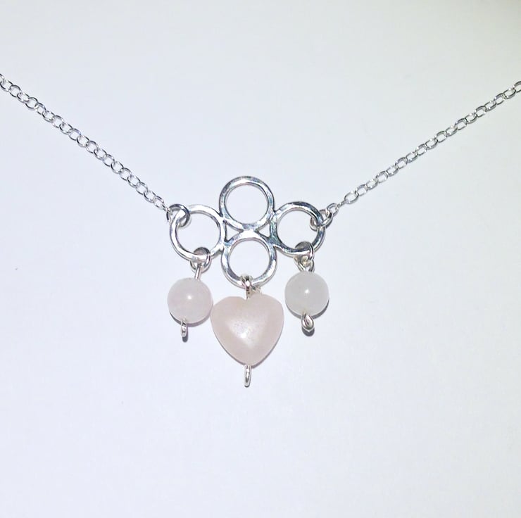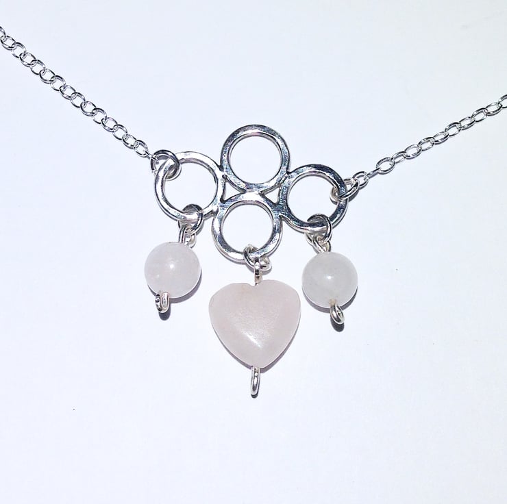 For this necklace I have combined beautiful rose quartz beads, including a heart shaped bead, with sterling silver handmade components.