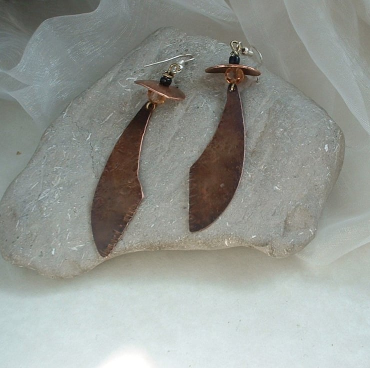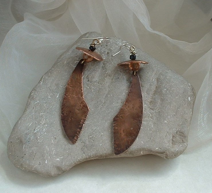 Beautiful rustic earrings with a lovely movement created from shaped and textured copper plate with glass beads added for a touch of sparkle. Finished with a rich antique patina sealed with a silicon wax polish and sterling silver ear wires.