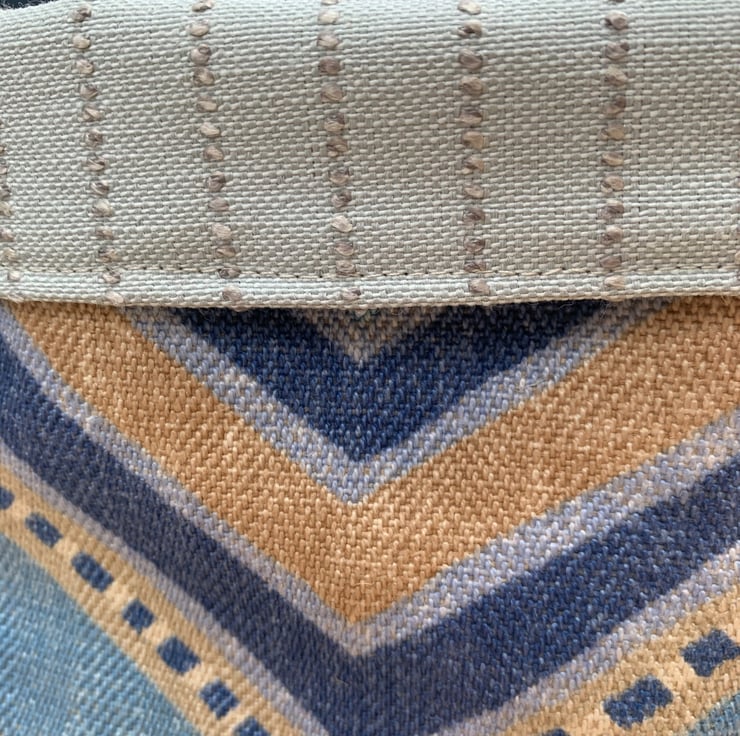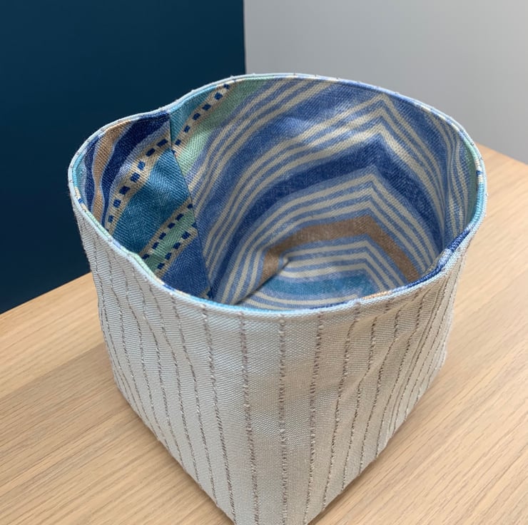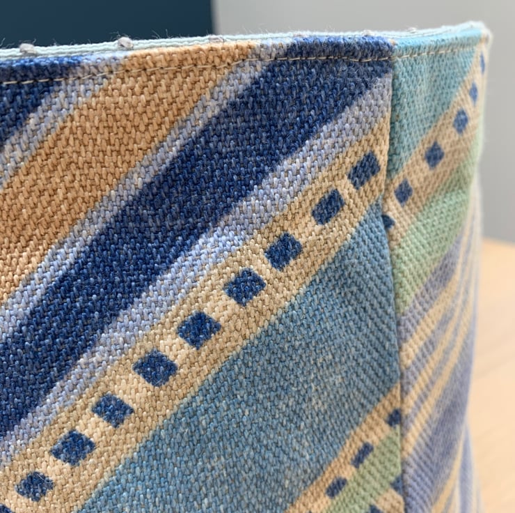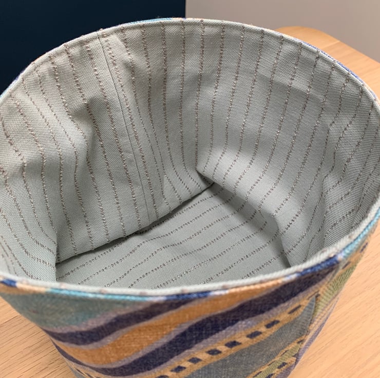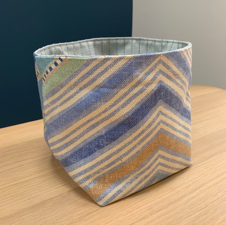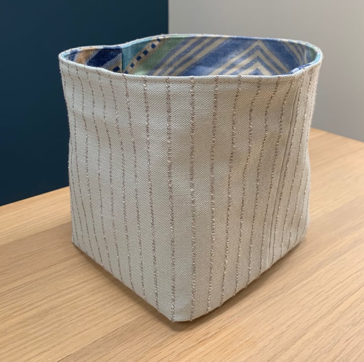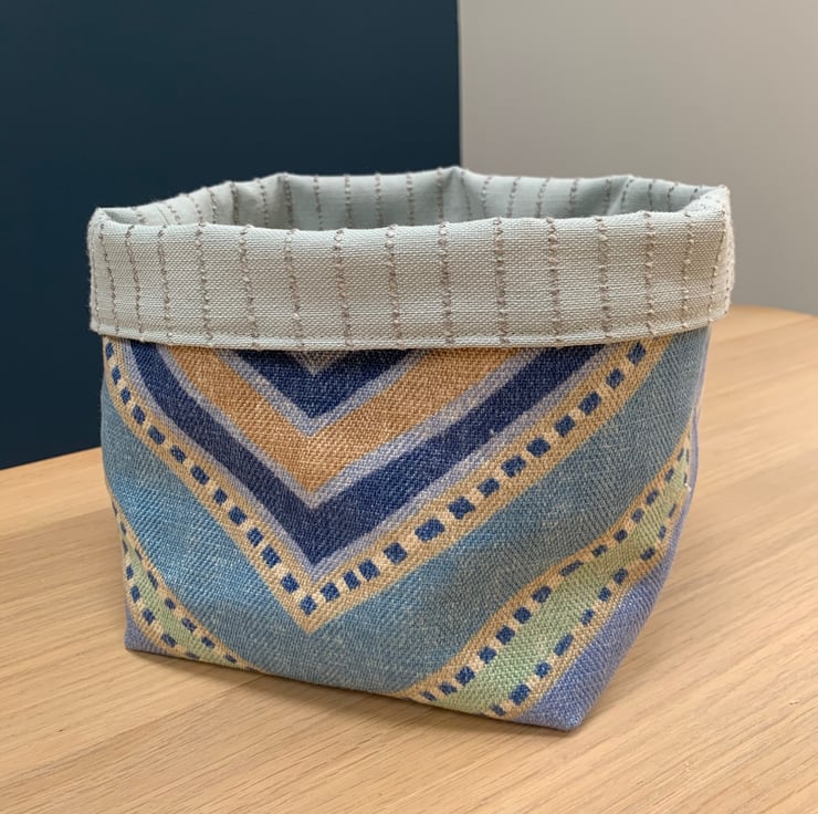 Reversible fabric storage basket made from Osborne and Little Fez fabric which is a cotton and jute mix and a pale blue fabric with a textured pin stripe. Can be used with a turn-down to make the most of the contrasting fabrics.
