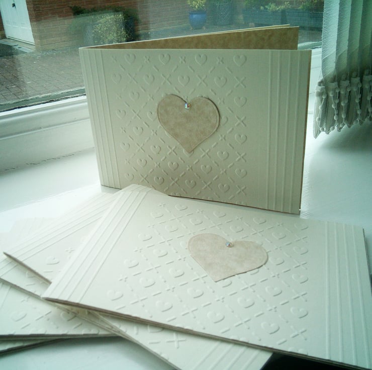 A completely handmade and uniquely designed pack of 6 sane design cards. Consisting of quality cream card which has been embossed with a pretty hearts and crosses design. A heart die cut from beige parchment card is in the centre. Finished off with a sparkly rhinestone..beige parchment paper insert which has been left blank for your own personal message