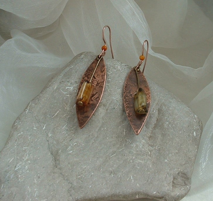 A simple yet beautiful design of textured copper cut into leaf shapes with brown green polished quartz stones dangles that contrast with the metal and add movement and light. Handmade copper ear wires with small orange seed beads complete the design and they are oxidised to give an antique patina and sealed with a silicon wax polish.
