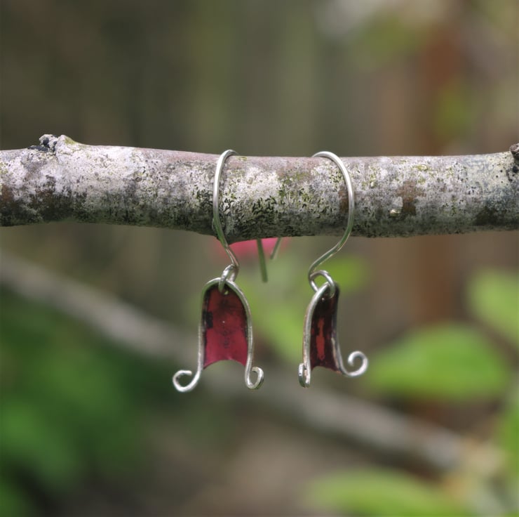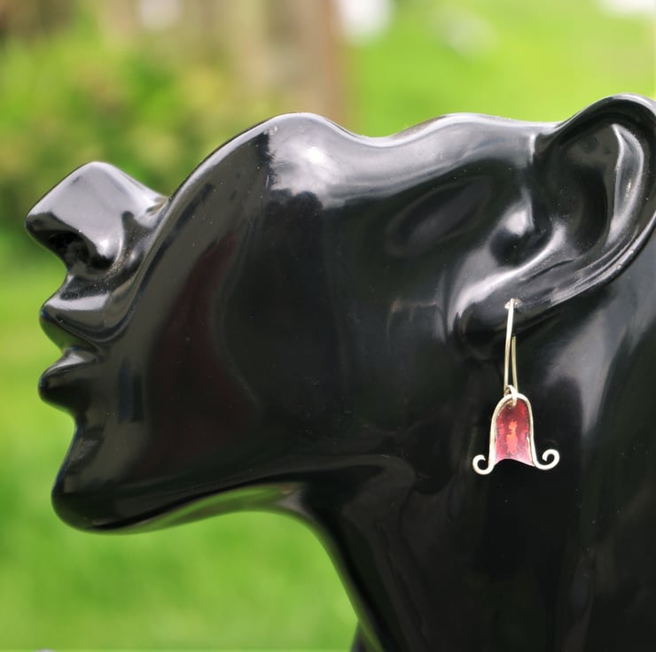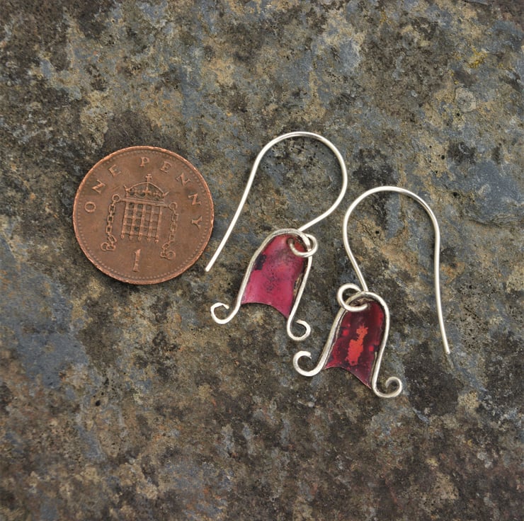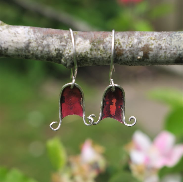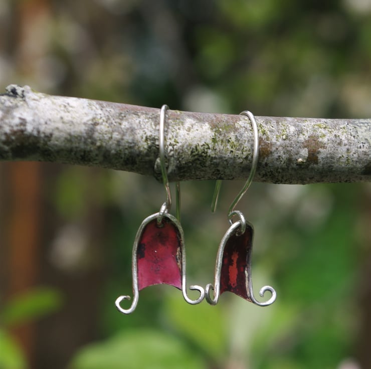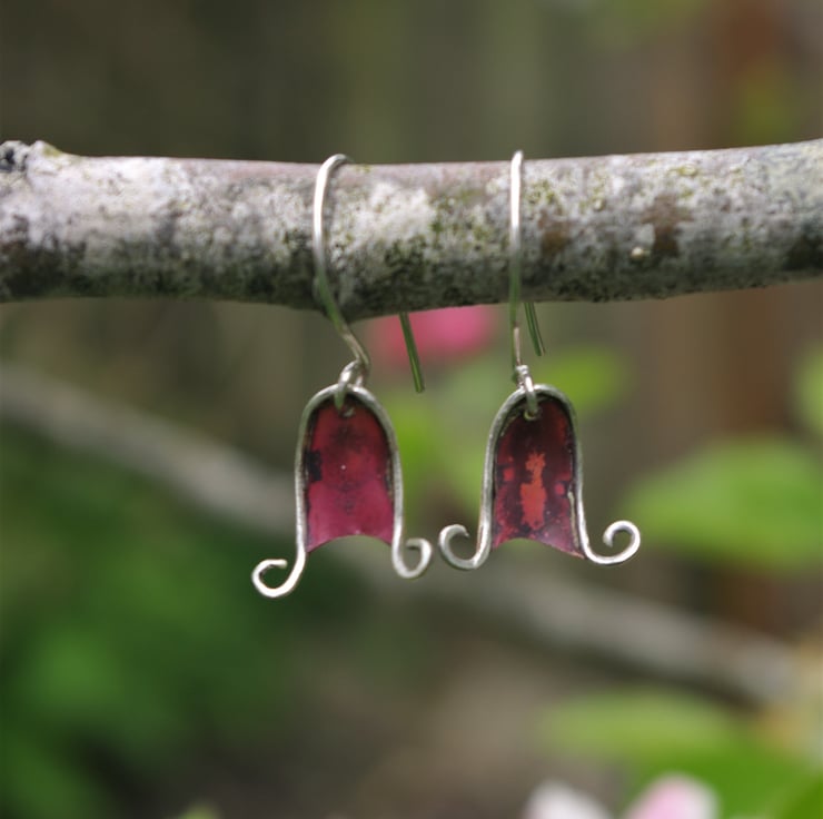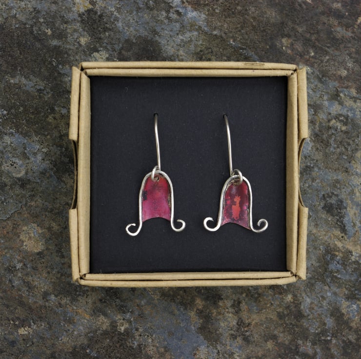 Inspired by bluebells, I have made some silver and copper bluebell dangle earrings from eco -sourced sterling silver wire and recycled copper sheet. I have curved the whole shape inwards and the tones on the copper of different reds have been achieved through heat.