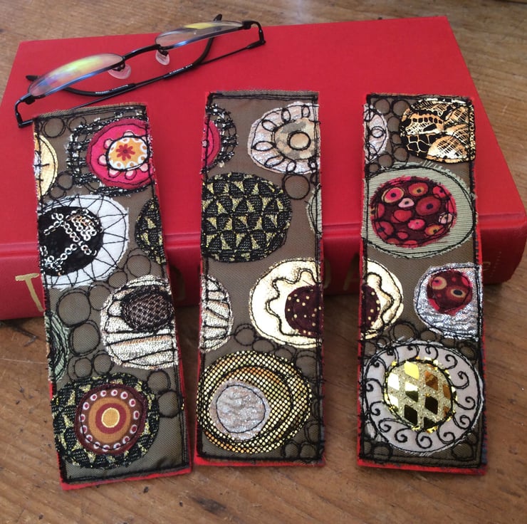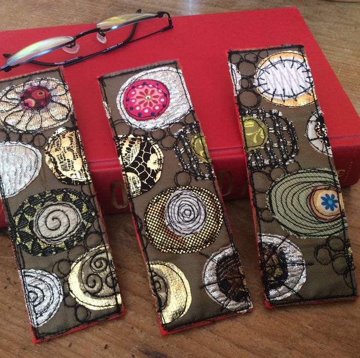 This embroidered gold patterned bookmark is made with layered up-cycled fabrics and enhanced with free motion embroidery. The pattern is influenced by Klimt and shows multiple patterned circles. The bookmark measures 5 x 15.5cm.