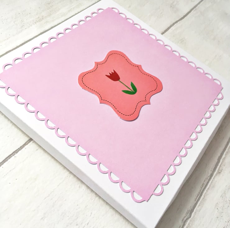 If you would prefer your card to be presented in a gift box wrapped in tissue paper then you can select that option instead. The box measures 16.5 by 16.5cm and is 1.5 cm deep approx. As the gift box will be made to match the card it may be different from the example in the photos.