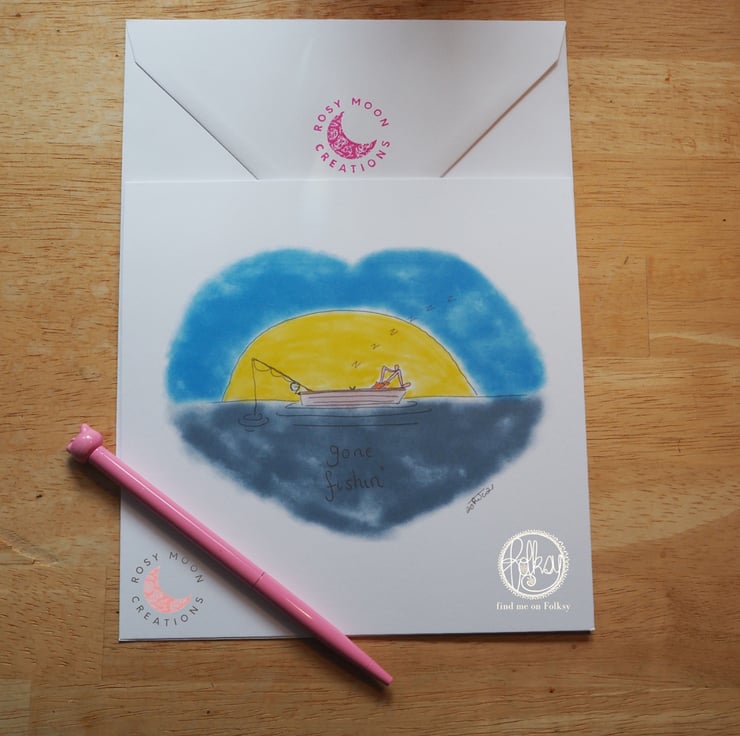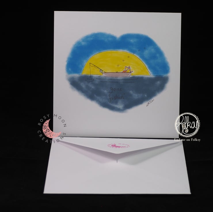 This little guy has gone fishin’ and is so chilled, he has dozed off. A fun card for any occasion.