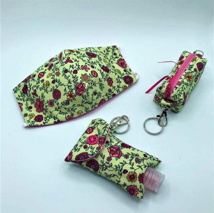 This listing is for the face mask only. Please look at my other listings for matching items (keyring bag and hand gel holder) as per photo. These items are not included in this listing.