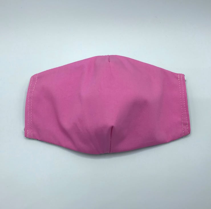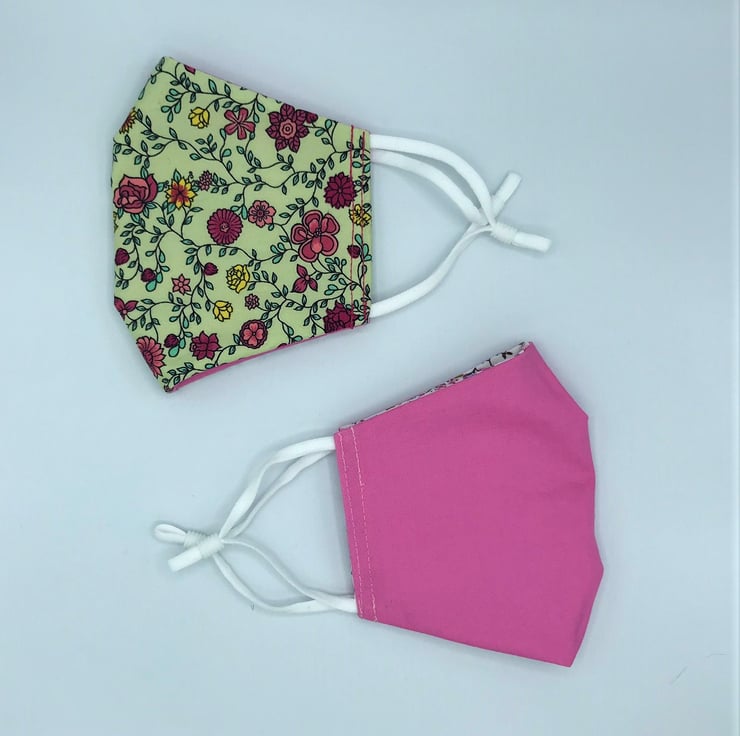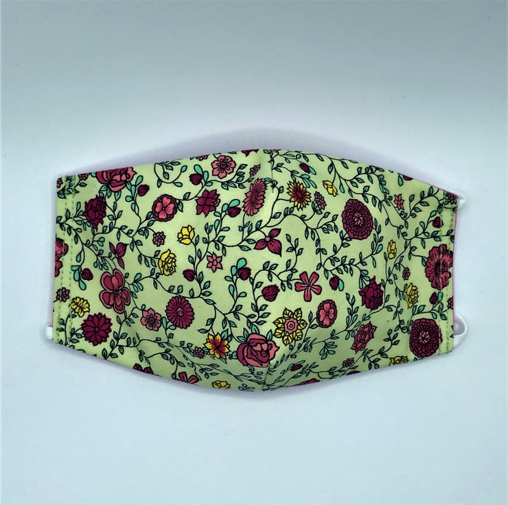 This is a double sided face mask, made from a light green fabric with pink flowers on one side and a pink plain fabric on the other.