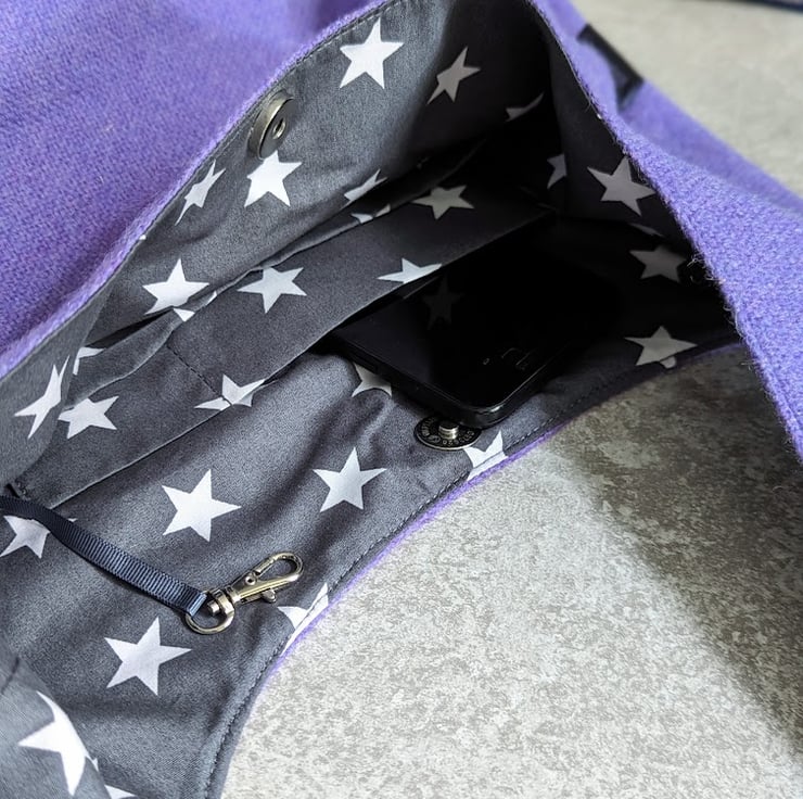 It is lined with a star print grey cotton poplin and has a number of slip pockets, one which has been divided for phone and pens etc, another has a plastic snap closure for added security. For those of us who lose our keys in the bottom of our bag, there's a swivel lobster clasp secured to the inside of the bag with a grosgrain ribbon. The opening is secured with a silver coloured magnetic closure.