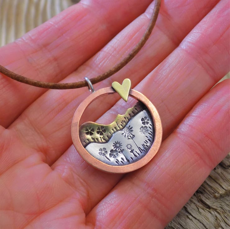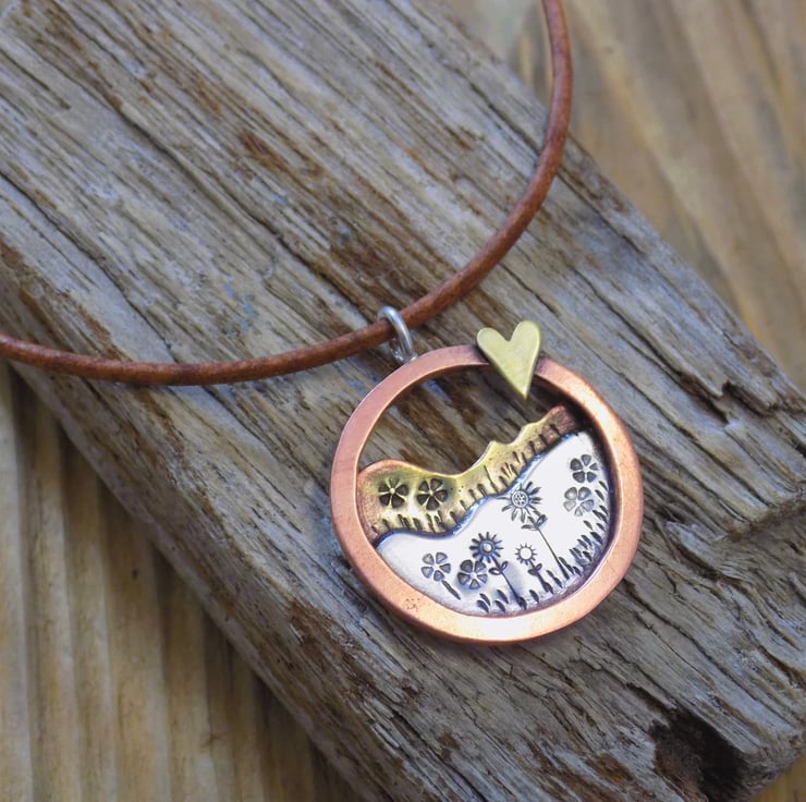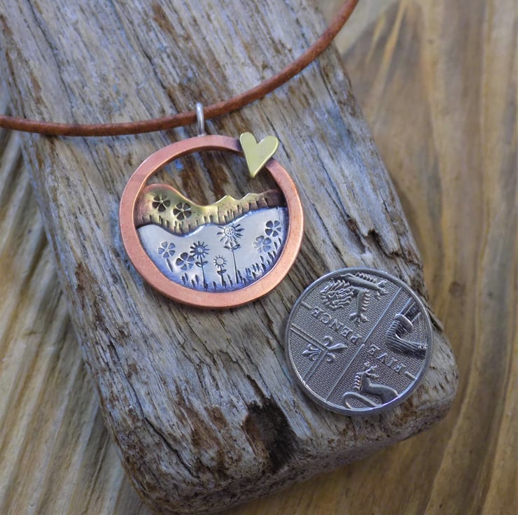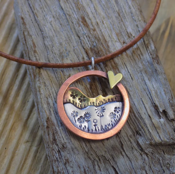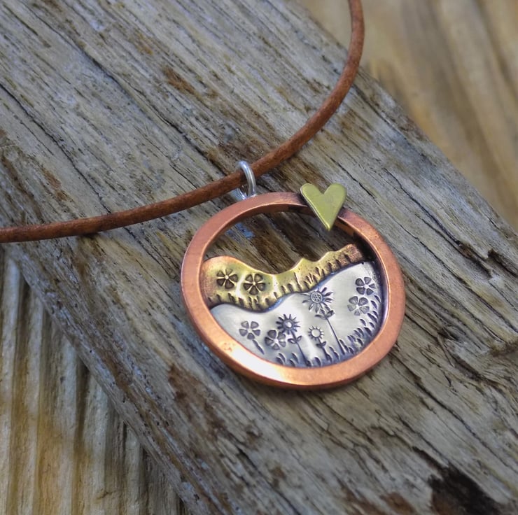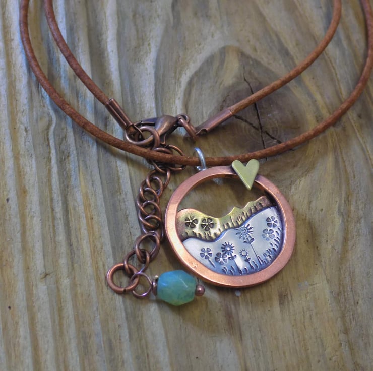 All hand sawn from various metal sheets. The copper circle is 1.5 mm thick and has silver and brass layered onto the back by carefully soldering each layer on. Lots of stamped flowers and grasses have been added and it hangs from a vintage brown leather necklace . To make it extra special a tiny brass heart has been added too! Adjustable from 16-18 " .