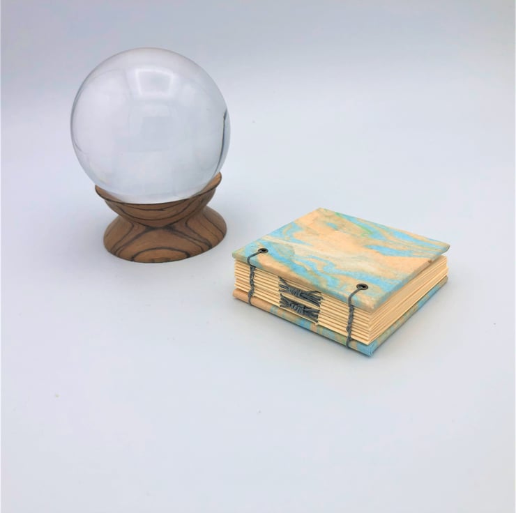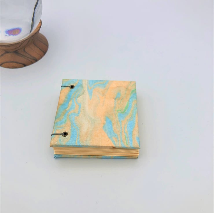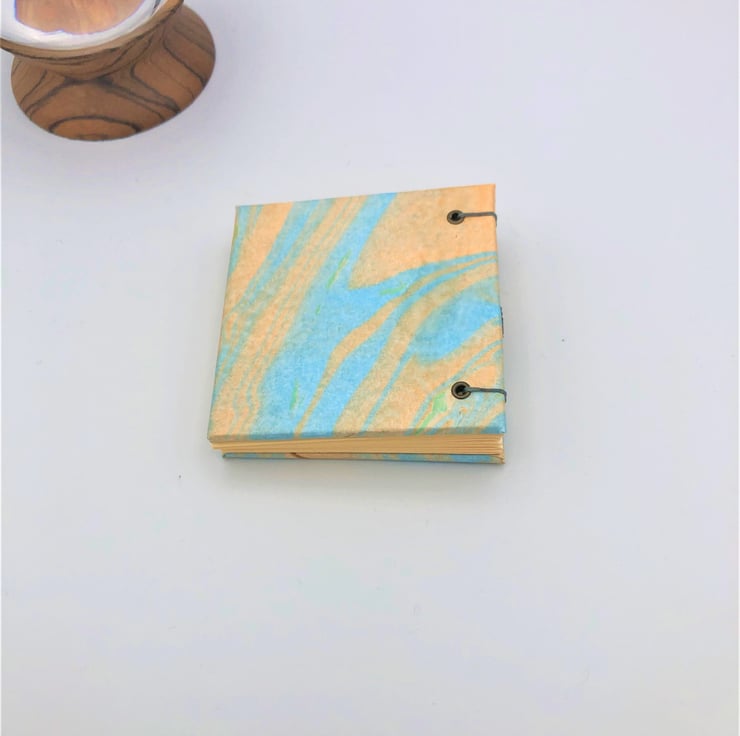 A fun mini, 7cm x 7cm notebook, covers of hand marbled paper in blue with yellow highlights. The pages are cream with brown waxed linen thread.