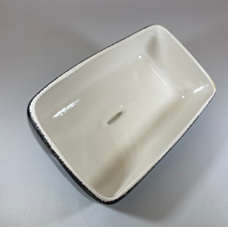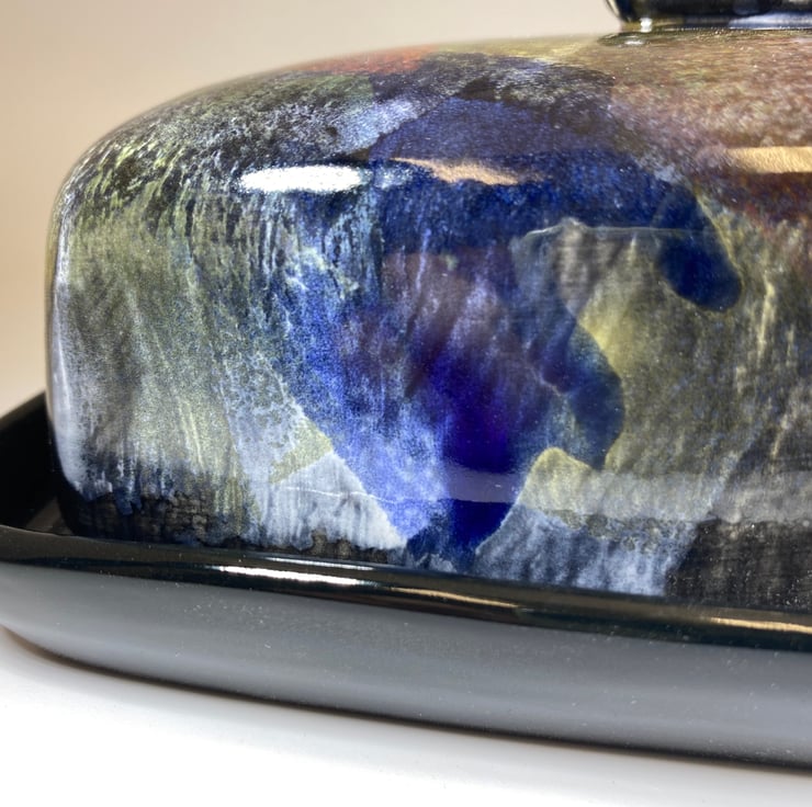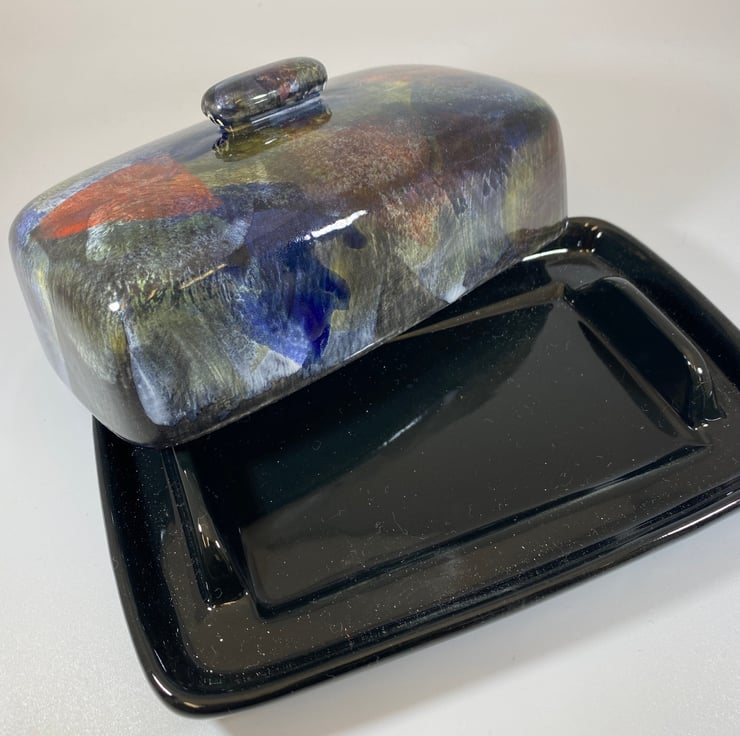 The random application of coloured glazes really makes this butter dish stand out.