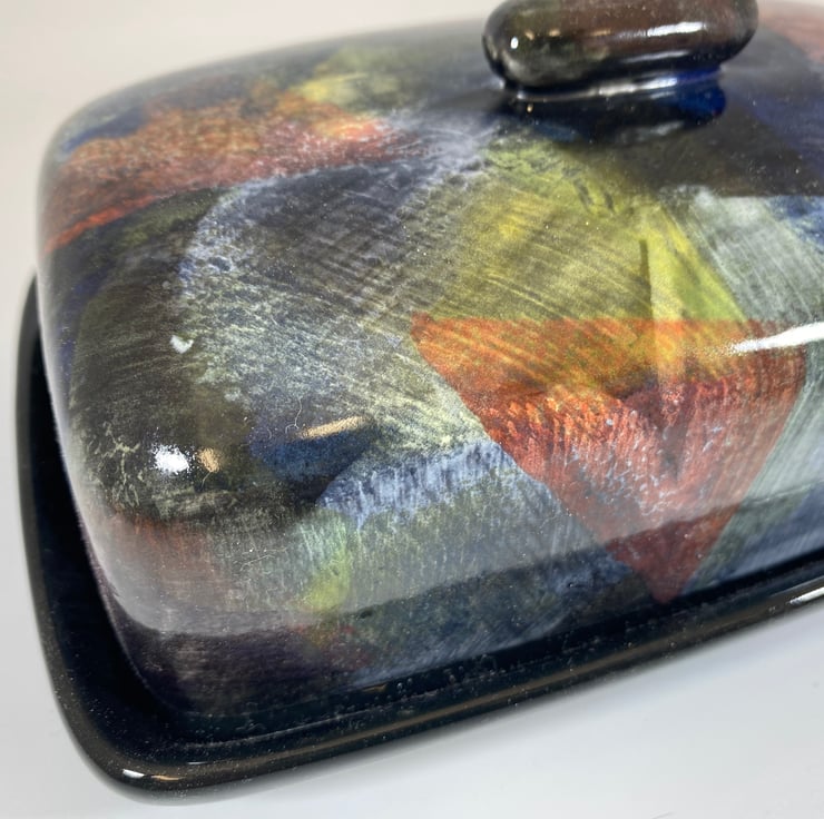 This is a brand new glaze design made in May 2021 where I wanted to design an unusual pattern of colours on a butter dish lid that makes a bold statement on the table.