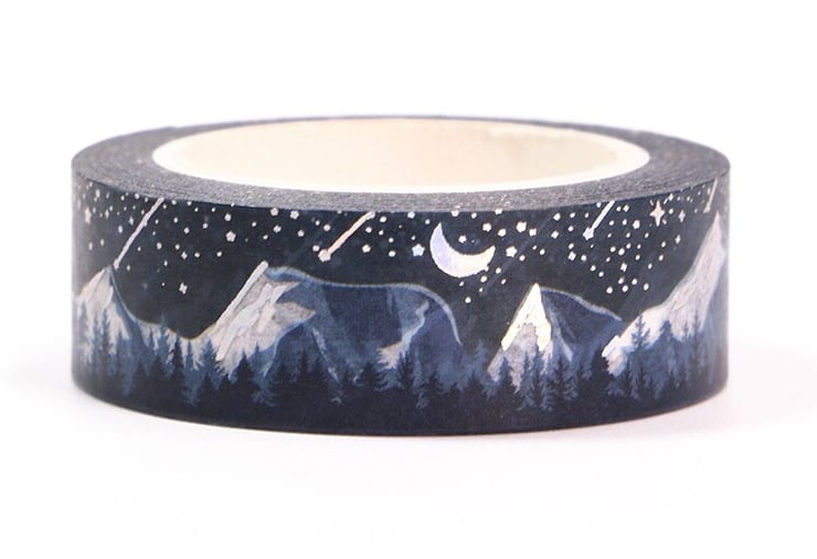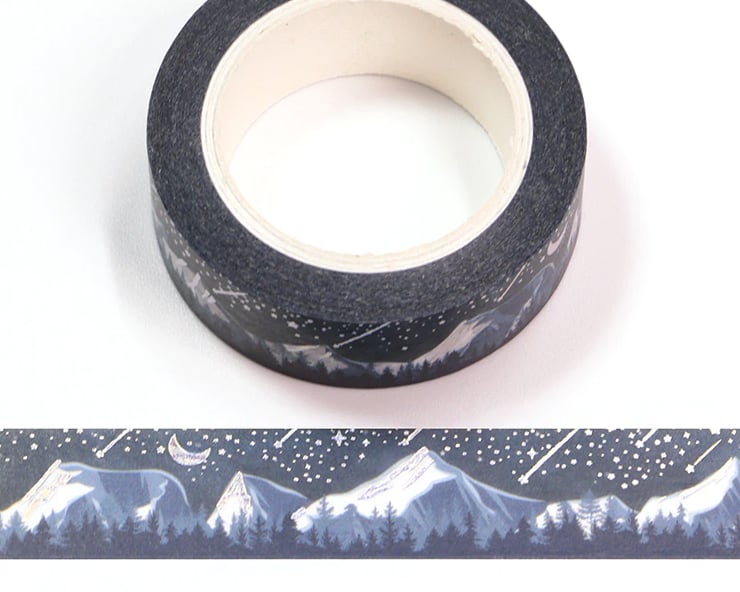 Dark blue/black mountains, with silver capped mountain tops, with shooting stars in the night sky washi tape.