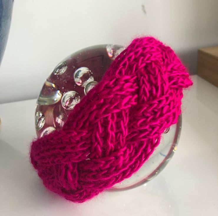 This headband was made at home by me. From boho spirit yarn in Azalea. A gorgeous bright colour which seams to glow with sunshine.