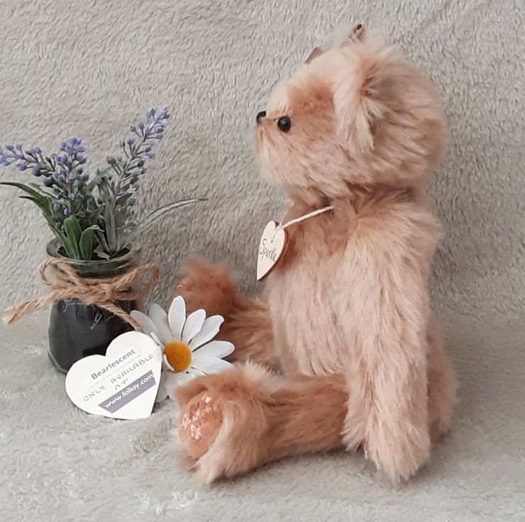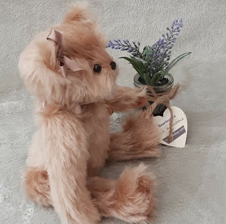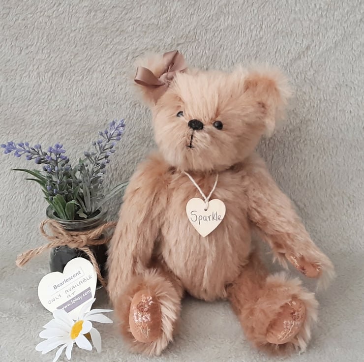 A beautiful keepsake bear, Sparkle is 5 way jointed with cotter pins making her a fully poseable bear. She has brown safety eyes fitted and a hand embroidered nose. She has a little satin bow in mink to one ear.