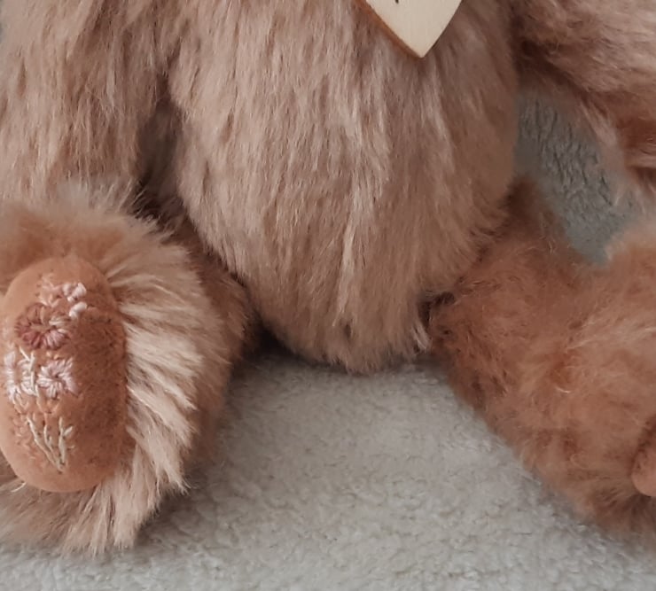 Hand made from luxury Steiff Schulte 17mm straight dense mohair in light fawn, she has hand embroidered paw pads with flowers in terracotta's and pinks onto matching faux cashmere fabric.