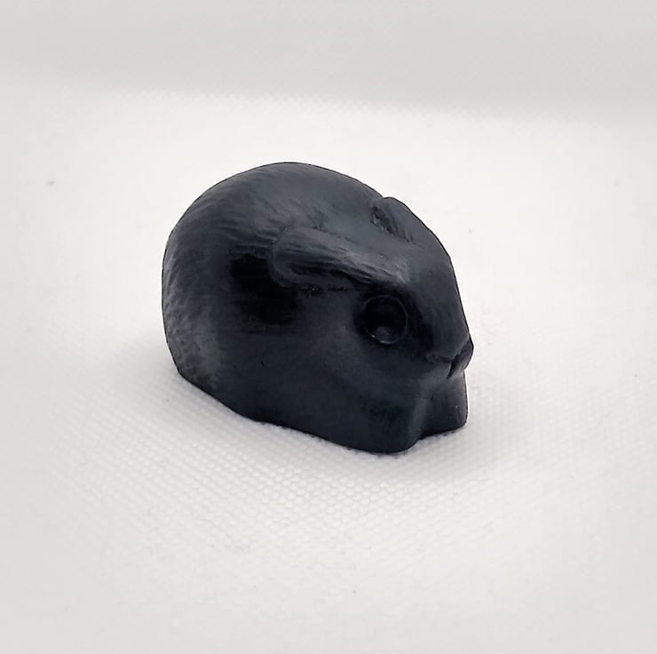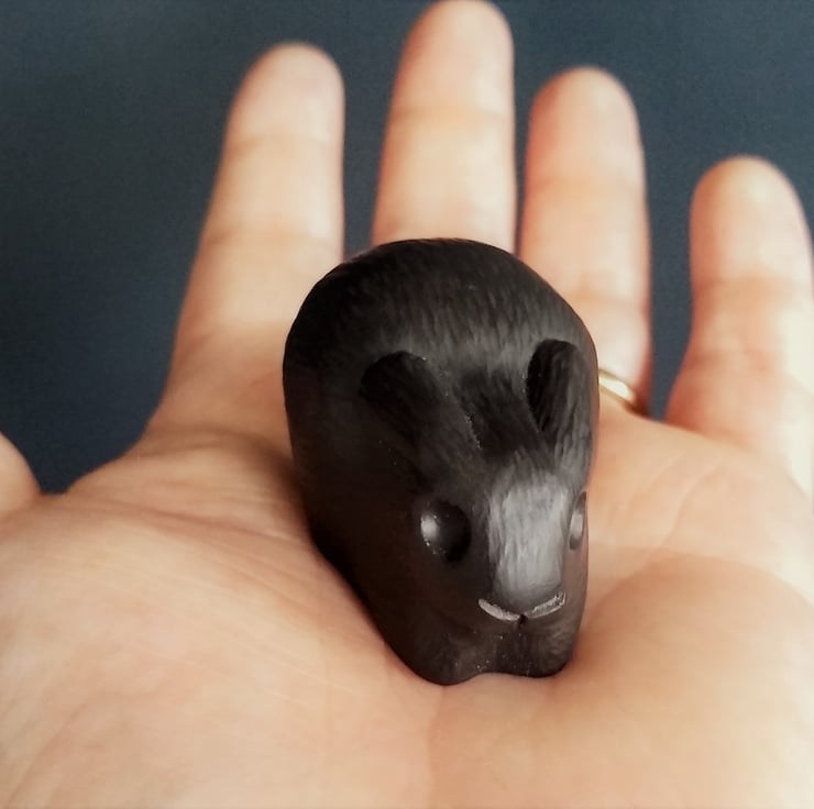 This rabbit miniature has been made using the cold cast method of adding real metal powder (in this case Iron) to resin. This results in a fairly tactile finish in Gun Metal. This rabbit will age and patina over time if polished and handled.