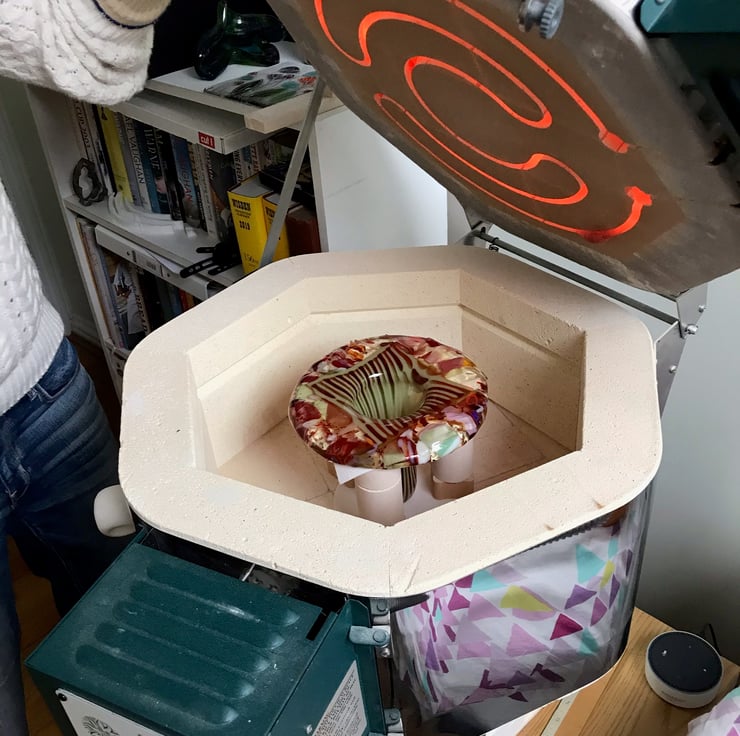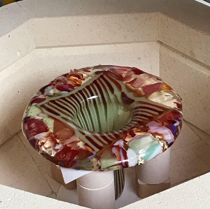 Each vase begins with hand-cut strips of glass in three complementary shades, carefully arranged into a striking pattern. The glass is then kiln-fired at 800°C for over 10 hours to fuse the layers into a solid panel. In a second firing, the panel is suspended over a ceramic ring and gently heated, allowing gravity to shape it into a sleek, organic vase form. The rim is hand-finished to a smooth, polished edge for a refined, gallery-quality look.