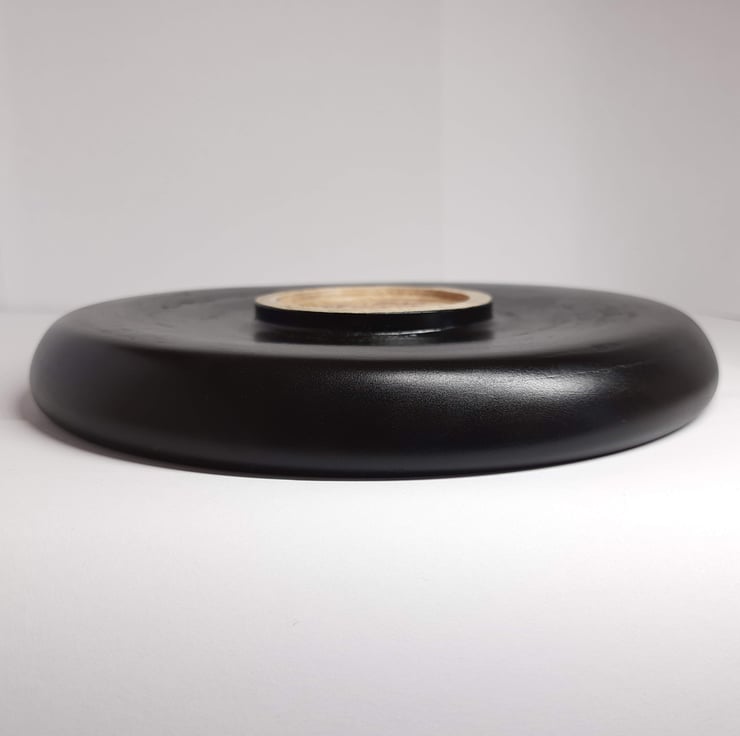 This is handmade on a wood lathe. The Beech is first rounded, before the outside is shaped. The undercutting towards the foot means the bowl rests only on the foot. Once shaped, it is hand sanded before sanding sealer, multiple coats of ebonising spray and finally an acrylic lacquer. The blank can then be turned around and mounted in the lathe chuck, where the inside is hollowed. As this was rather a shallow piece, I had to be careful not to turn it too deep and break through the other side, especially where it is undercut.